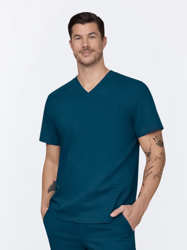 Turkusowe scrubsy męskie to jeden z najbardziej uniwersalnych wyborów w nowoczesnej odzieży medycznej. Łączą świeżość koloru z profesjonalnym charakterem, dlatego chętnie sięgają po nie zarówno studenci kierunków medycznych, jak i doświadczeni lekarze czy personel specjalistyczny. W tej kategorii dominują dwa odcienie: caribbean blue oraz teal, które różnią się charakterem, ale spełniają te same wysokie wymagania użytkowe.