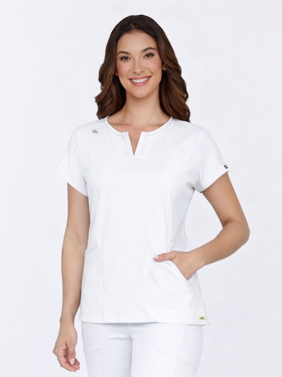 Lilias została zaprojektowana z myślą o ruchu i swobodzie. Elastyczne panele boczne z dzianiny rib-knit dopasowują się do ciała, zapewniając wygodę w każdej pozycji. Dwie ukryte kieszenie w szwach pozwalają na dyskretne przechowywanie drobiazgów, a pętelka na identyfikator ułatwia codzienną organizację. To detale, które czynią różnicę w dynamicznym środowisku pracy.