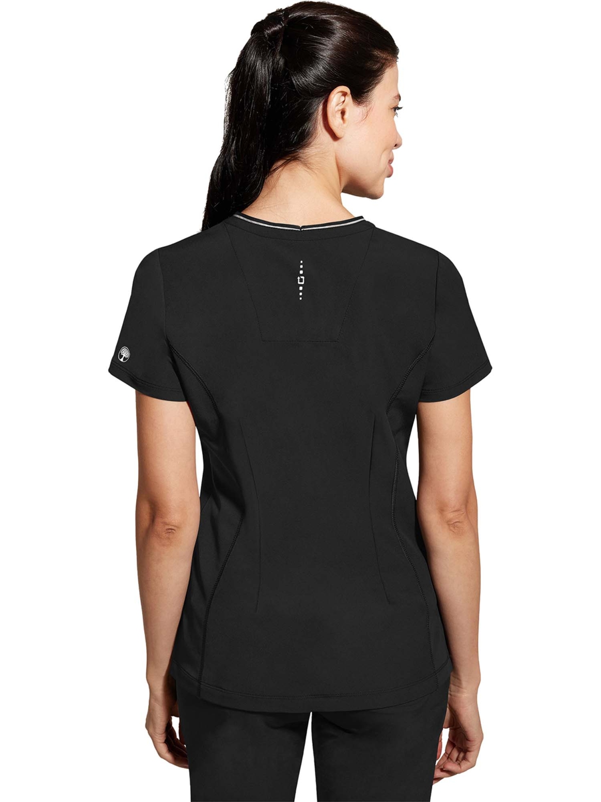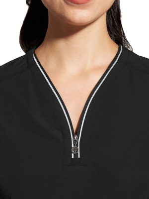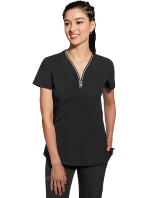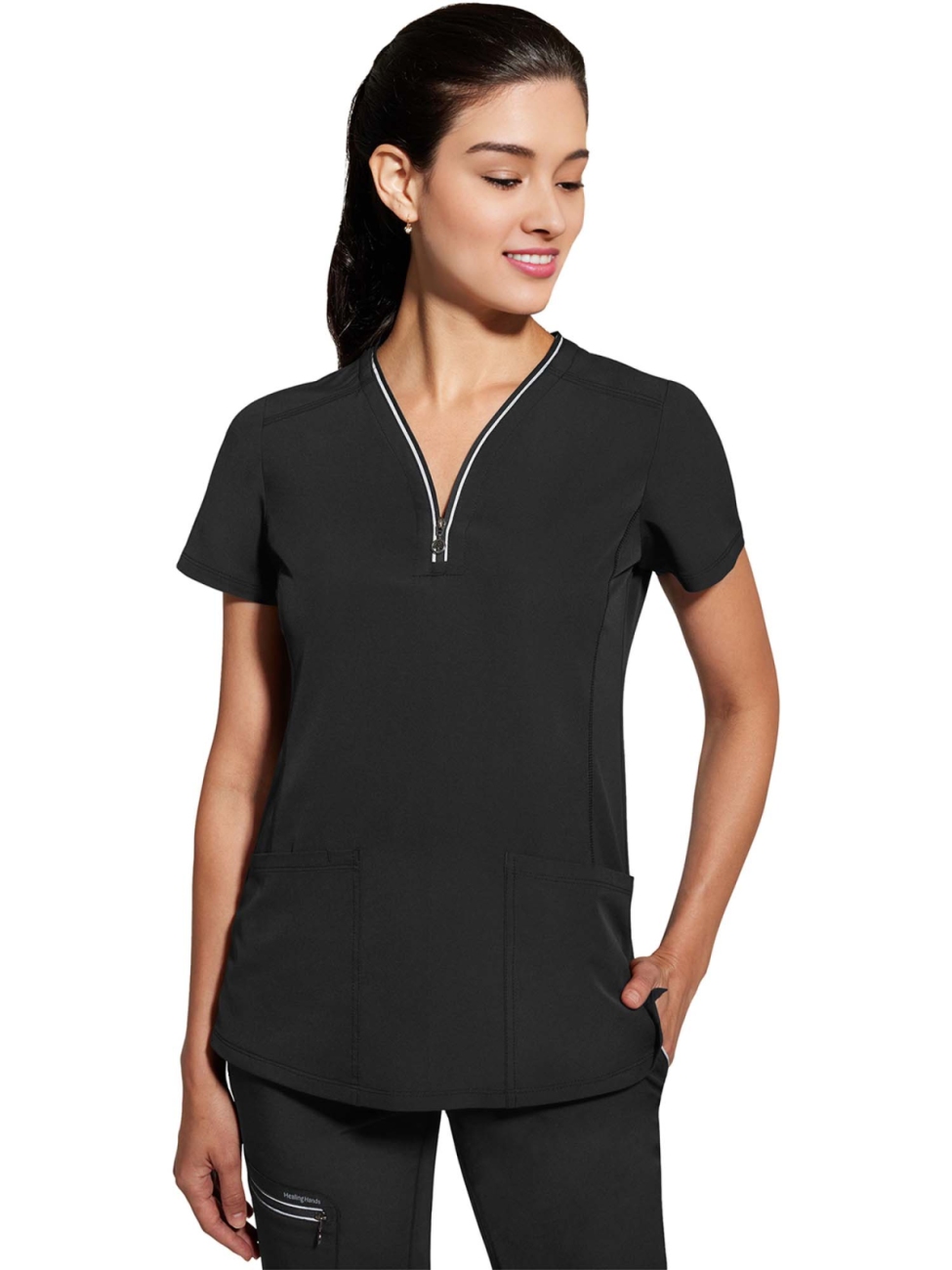 Lekko taliowana bluza medyczna z wdzięcznym dekoltem, wykończonym zameczkiem z kontrastową lamówką. Krótkie rękawki dobrze wyglądają z bocznymi wstawkami ozdobionymi ukośnymi przeszyciami.