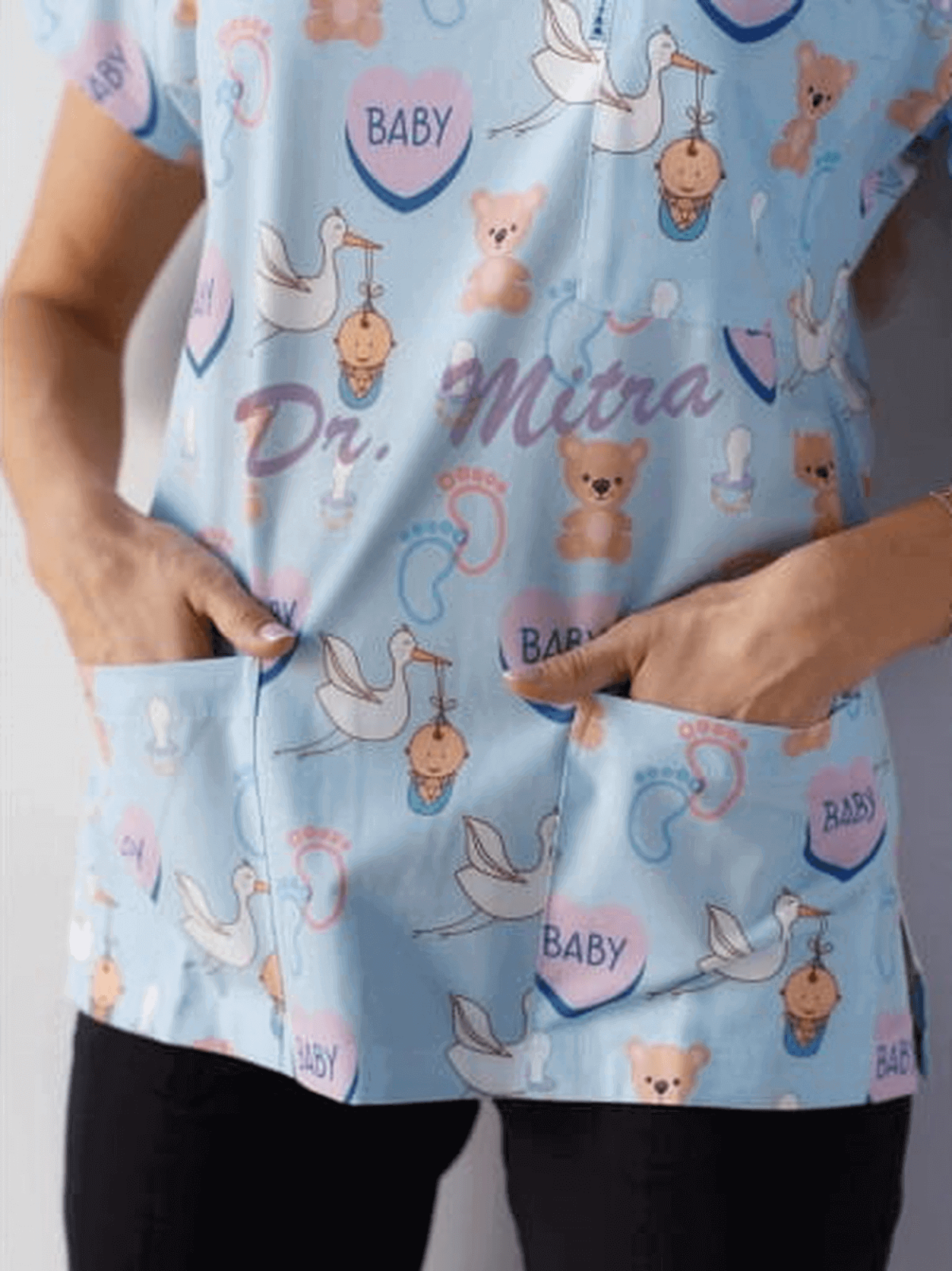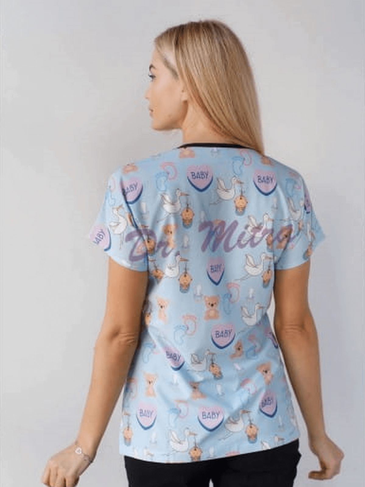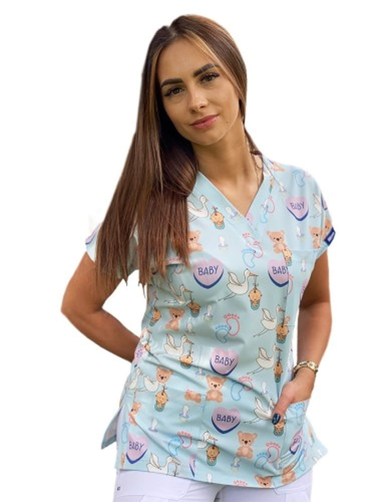 Bluza o klasycznym fasonie z dekoltem V-neck i dwiema niewielkimi kieszonkami, wyróżniająca się przepięknym wzorkiem w misie i bocianki dostarczające niemowlaki. Idealna nie tylko na oddział położniczy.