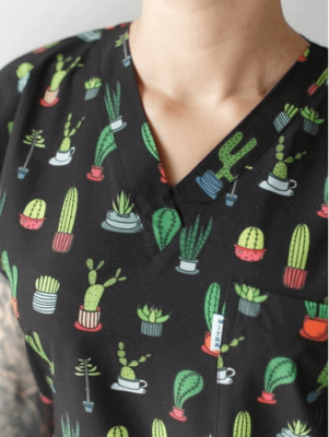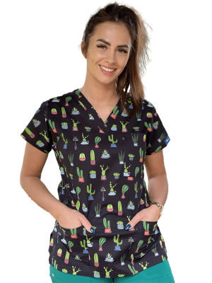 Bluza o klasycznym fasonie z dekoltem V-neck i dwiema niewielkimi kieszonkami, wyróżniająca się nietypowym wzorkiem w kaktusy różnych odmian.