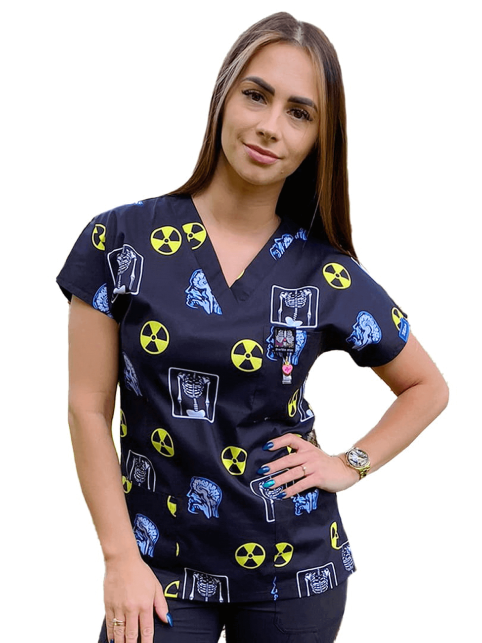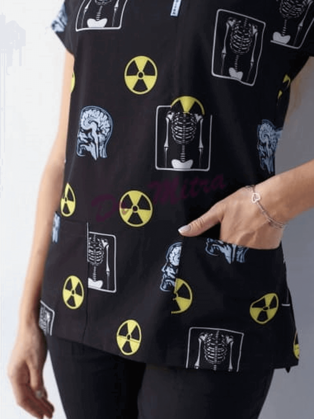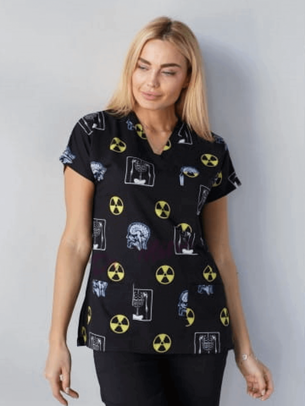 Bluza o klasycznym fasonie z dekoltem V-neck i dwiema niewielkimi kieszonkami, wyróżniająca się jedynym i niepowtarzalnym wzorkiem z ikonkami prosto z pracowni rentgenowskiej.
