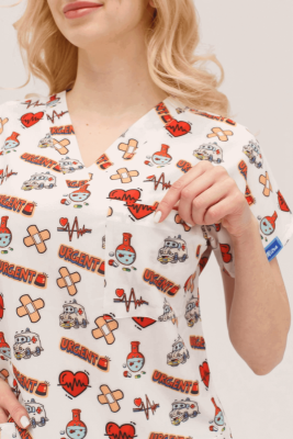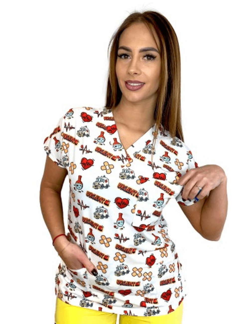 Bluza o klasycznym fasonie z dekoltem V-neck i dwiema niewielkimi kieszonkami, ozdobiona tematycznymi obrazkami prosto z ostrego dyżuru przyjmującego nagłe przypadki.