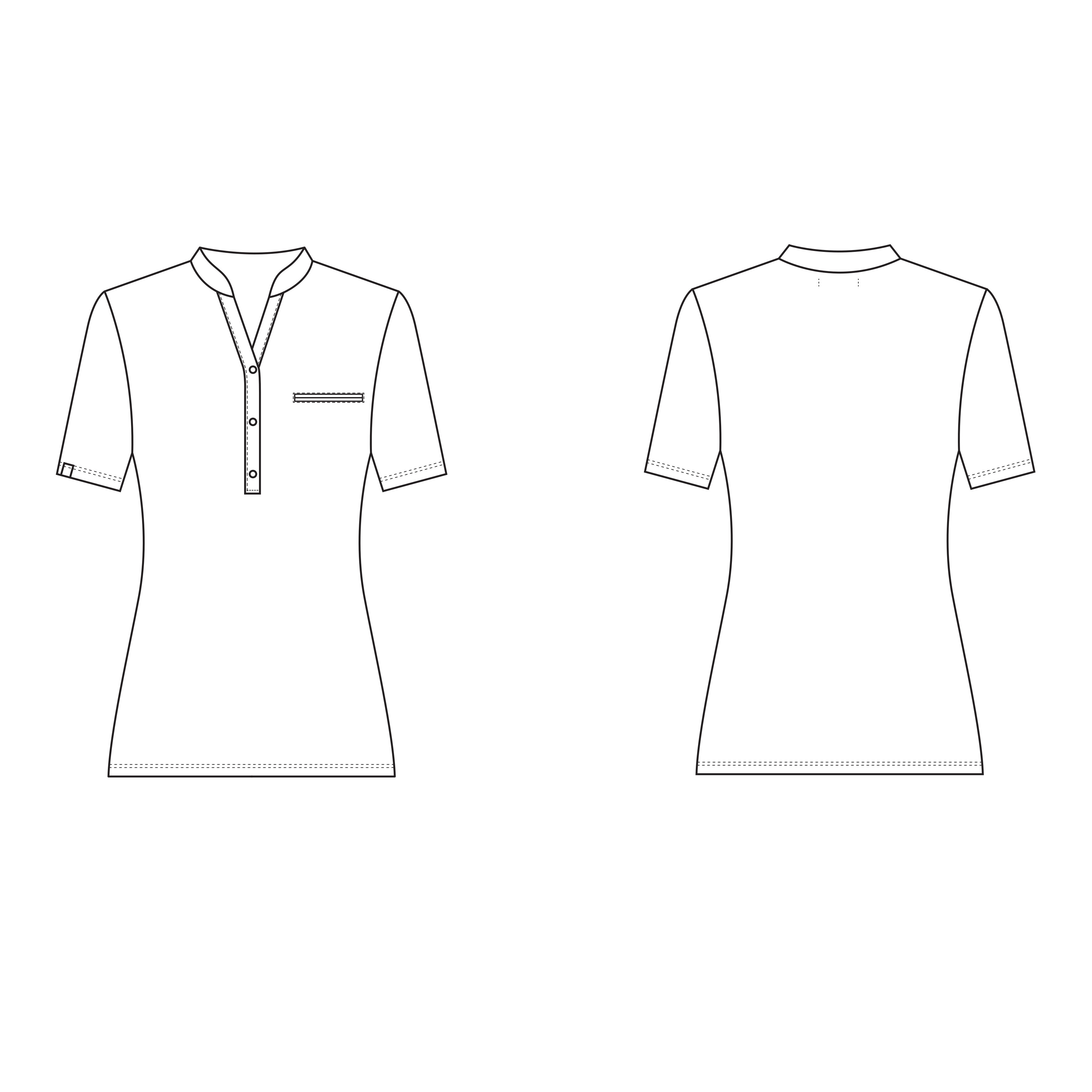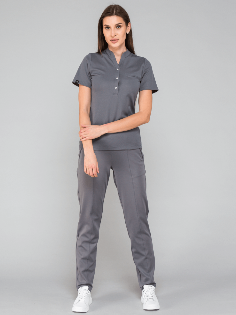 Dzianinowa bluza medyczna z krótkim rękawem oraz dekoltem na zatrzaski pozwalające na regulowanie jego głębokości.