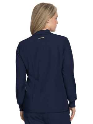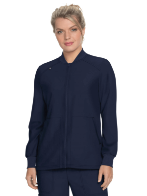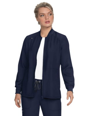 Damska bluza medyczna z długimi rękawami zabezpieczonymi szerokimi ściągaczami rozpinana na zamek, miękka w dotyku, z dwoma kieszeniami po bokach.