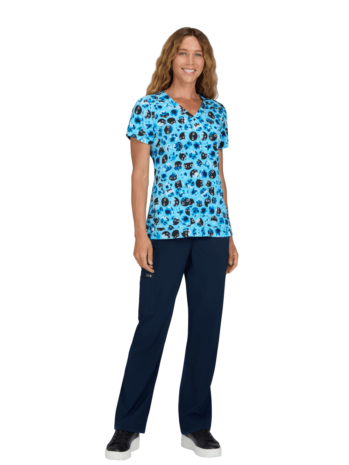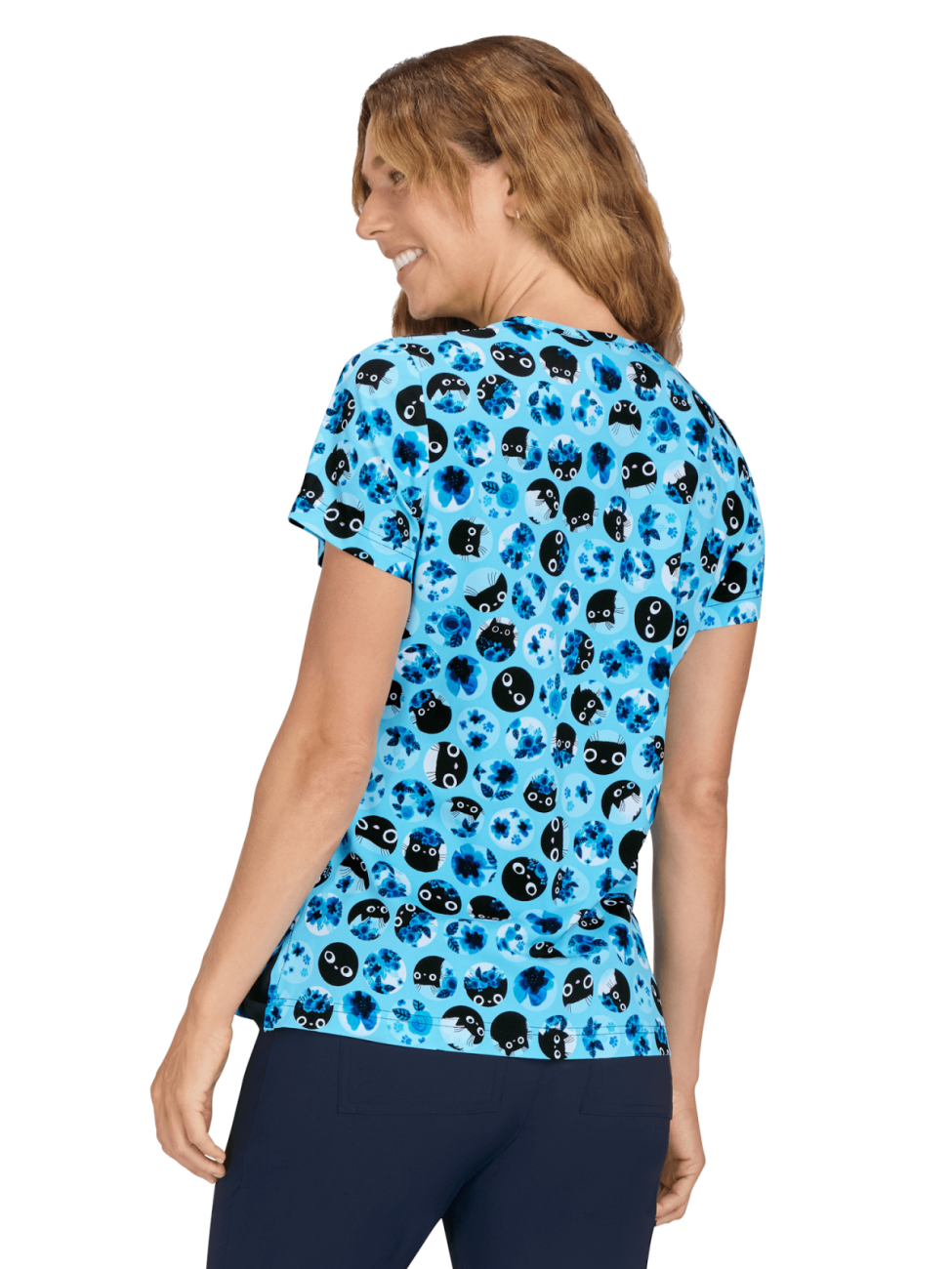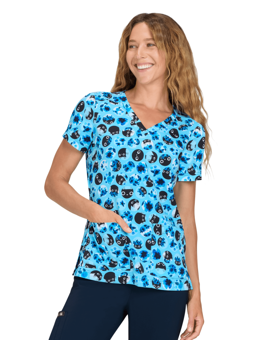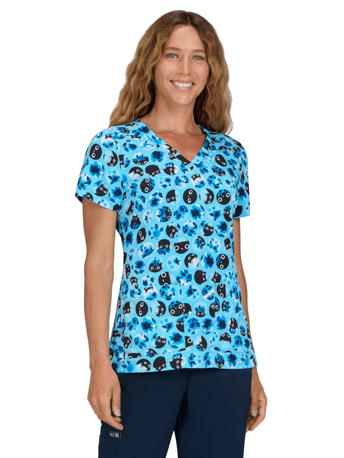 Bluza medyczna Blue Flower Cat z kolekcji koi Artists Series to uroczy wzór główek kotków otoczonych kwiatami na jasnoniebieskim tle. Świetnie komponuje się ze spodniami w czerni lub dowolnym odcieniu niebieskiego.