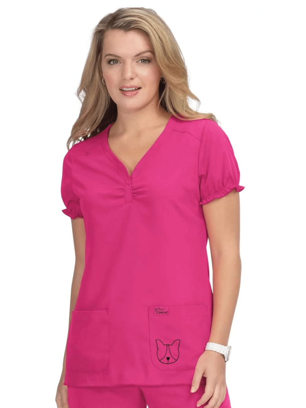 Stylowa bluza medyczna w odcieniu intensywnego różu z dekoltem w kształcie serca i bufiastymi ramionami. Pętelka na ramieniu, dwie przednie kieszenie, jedna z wyhaftowanym kultowym buldożkiem francuskim Betsey Johnson.