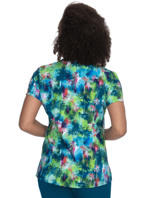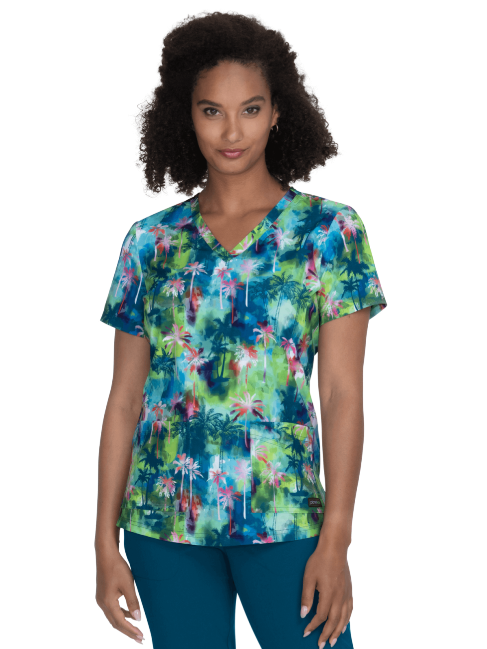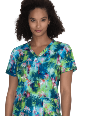Bluza medyczna w tropikalne palmy, wykończona dekoltem V-neck. Drobiazgi wsuniesz do 2 kieszeni ze skośnym wejściem ozdobionym lamówkami.