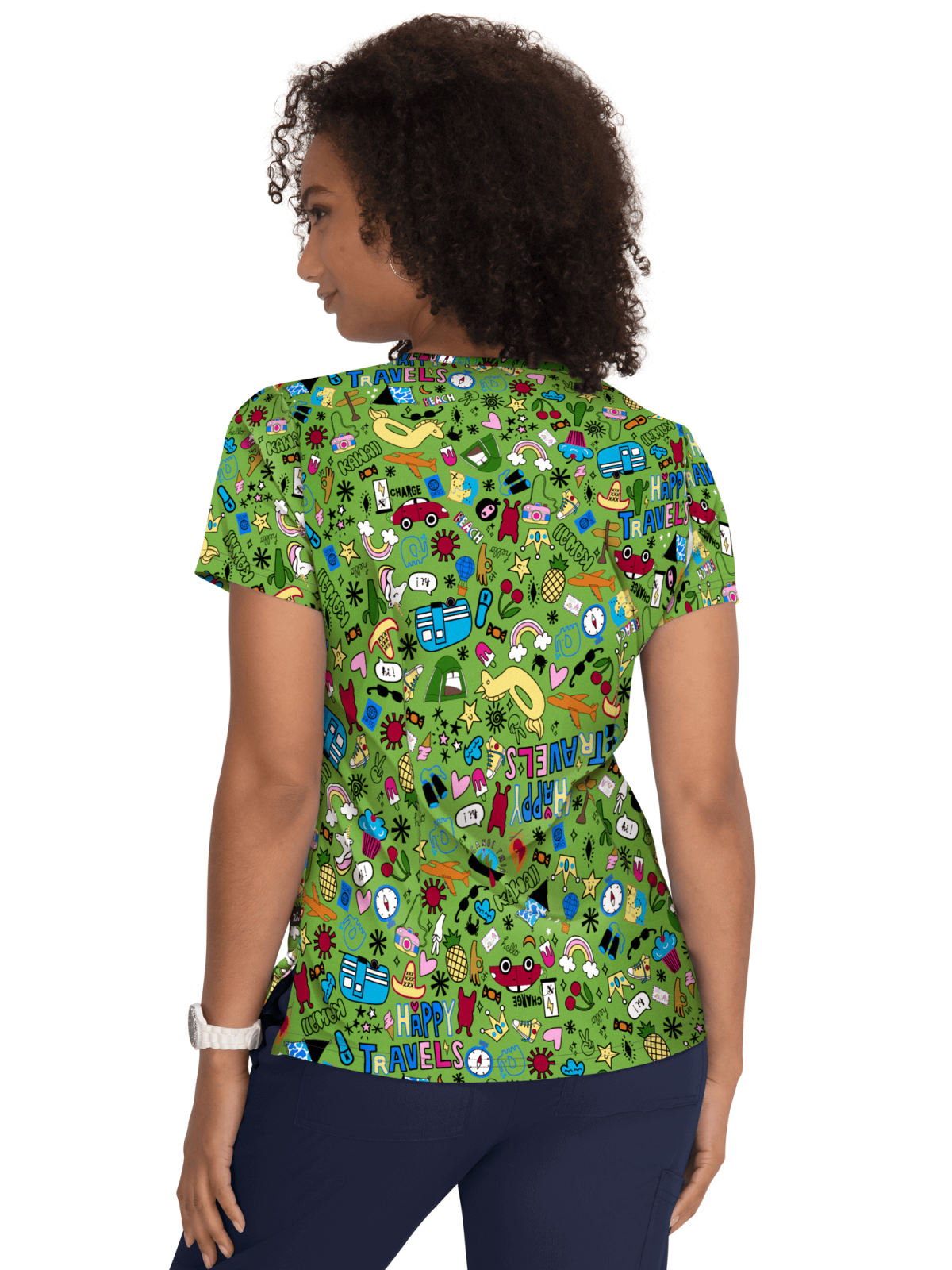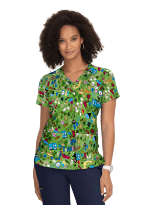 Kolorowa damska bluza medyczna we wzorek na zielonym tle. Lekko dopasowana do figury, ma 2 kieszenie i pętelkę na zawieszkę do identyfikatora.
