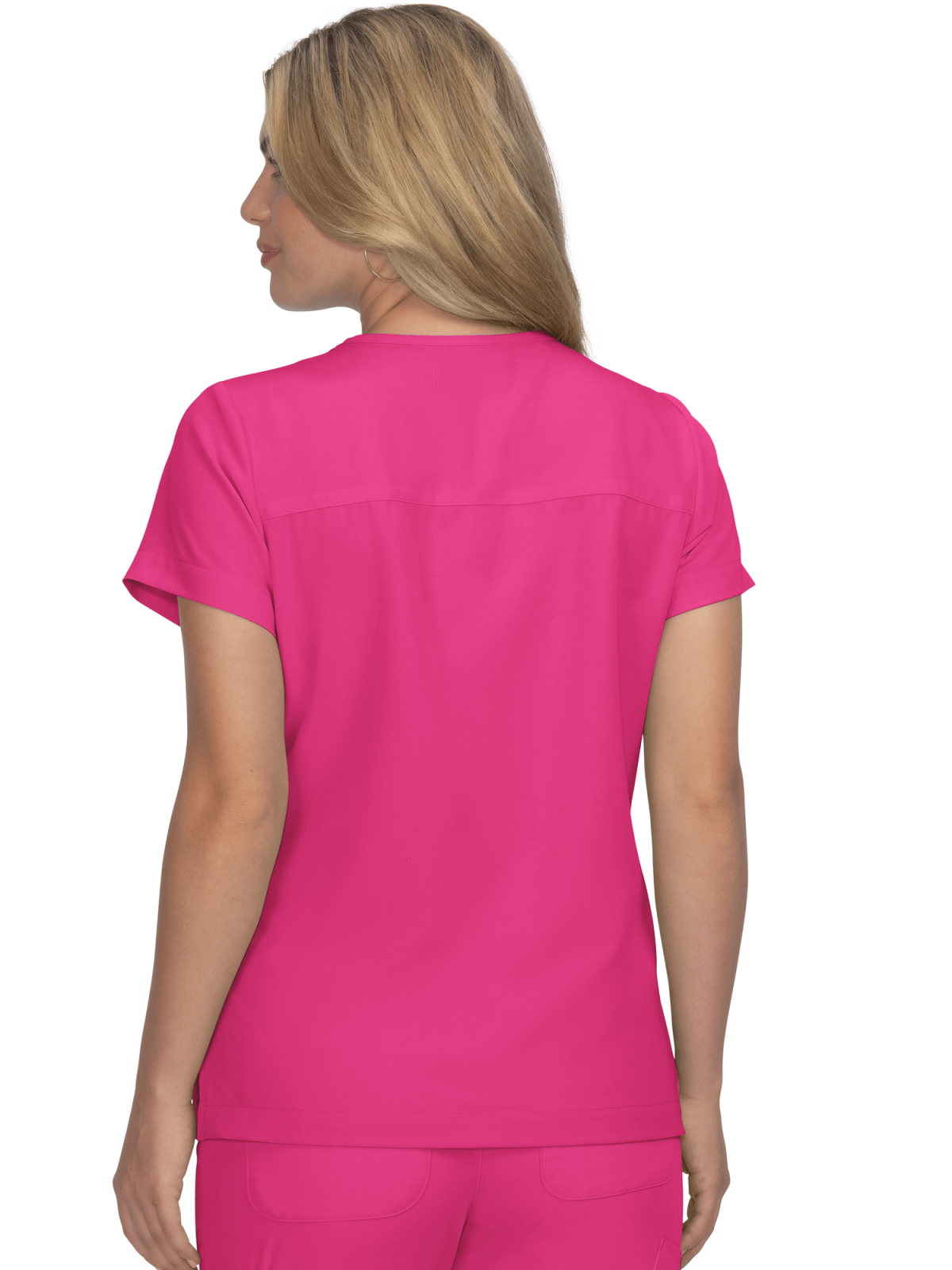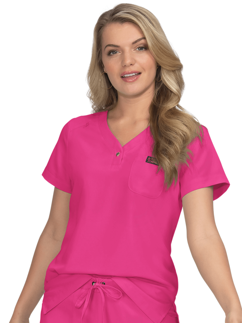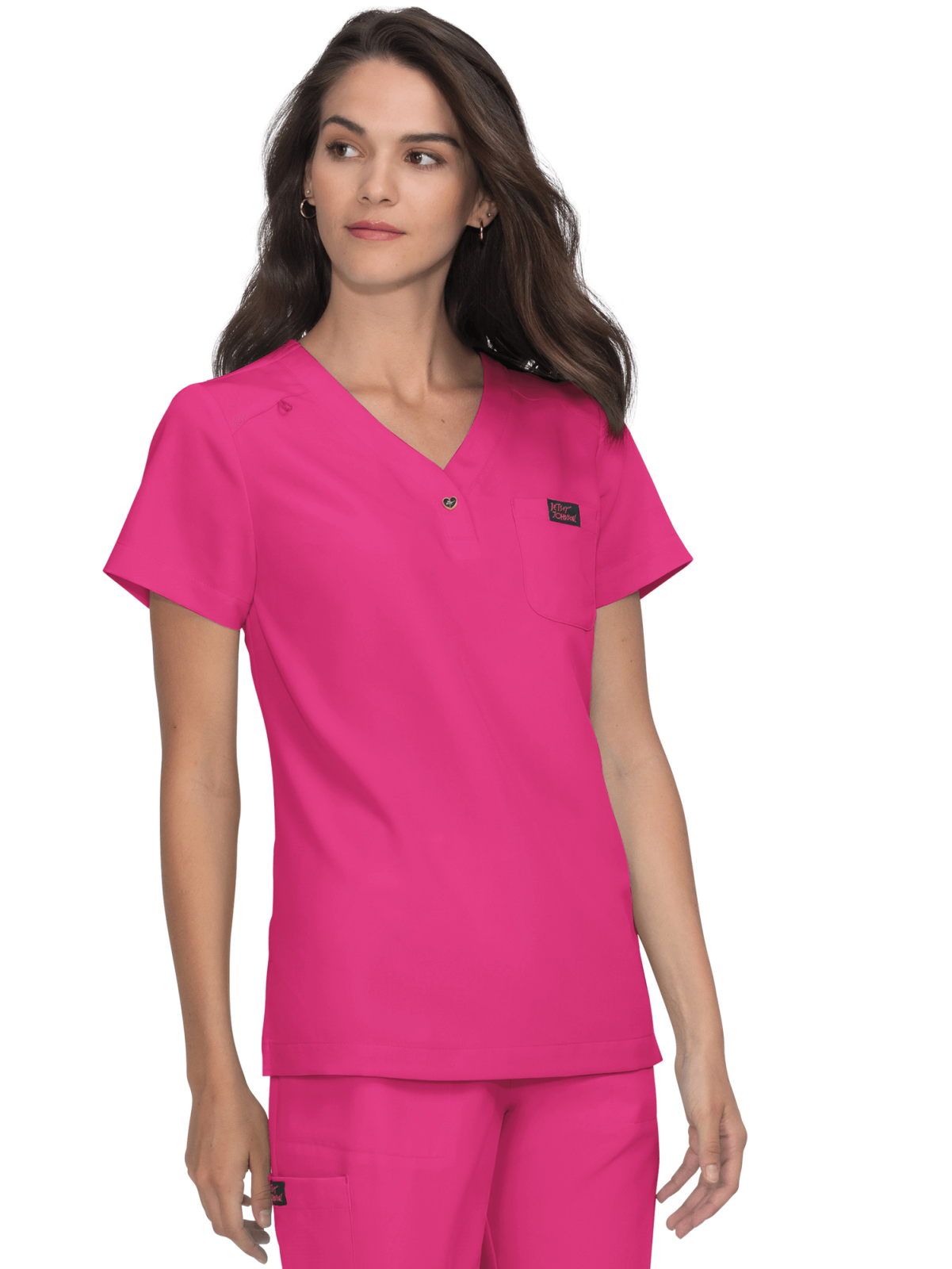 Ta bluza medyczna na pewno skradnie Twoje serce, dzięki guziczkowi na zatrzask w kształcie serduszka w centralnym miejscu, na nieszablonowo skrojonym dekolcie w kształt miękko zakończonej litery V z zakładką.