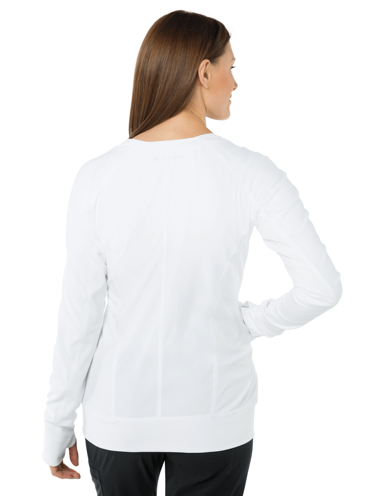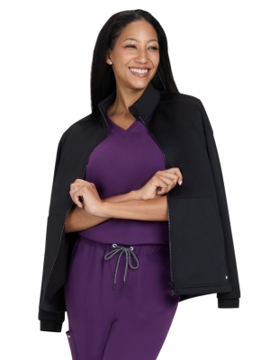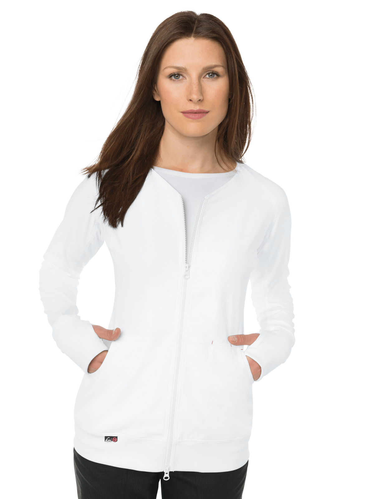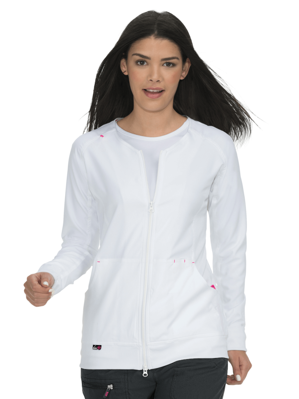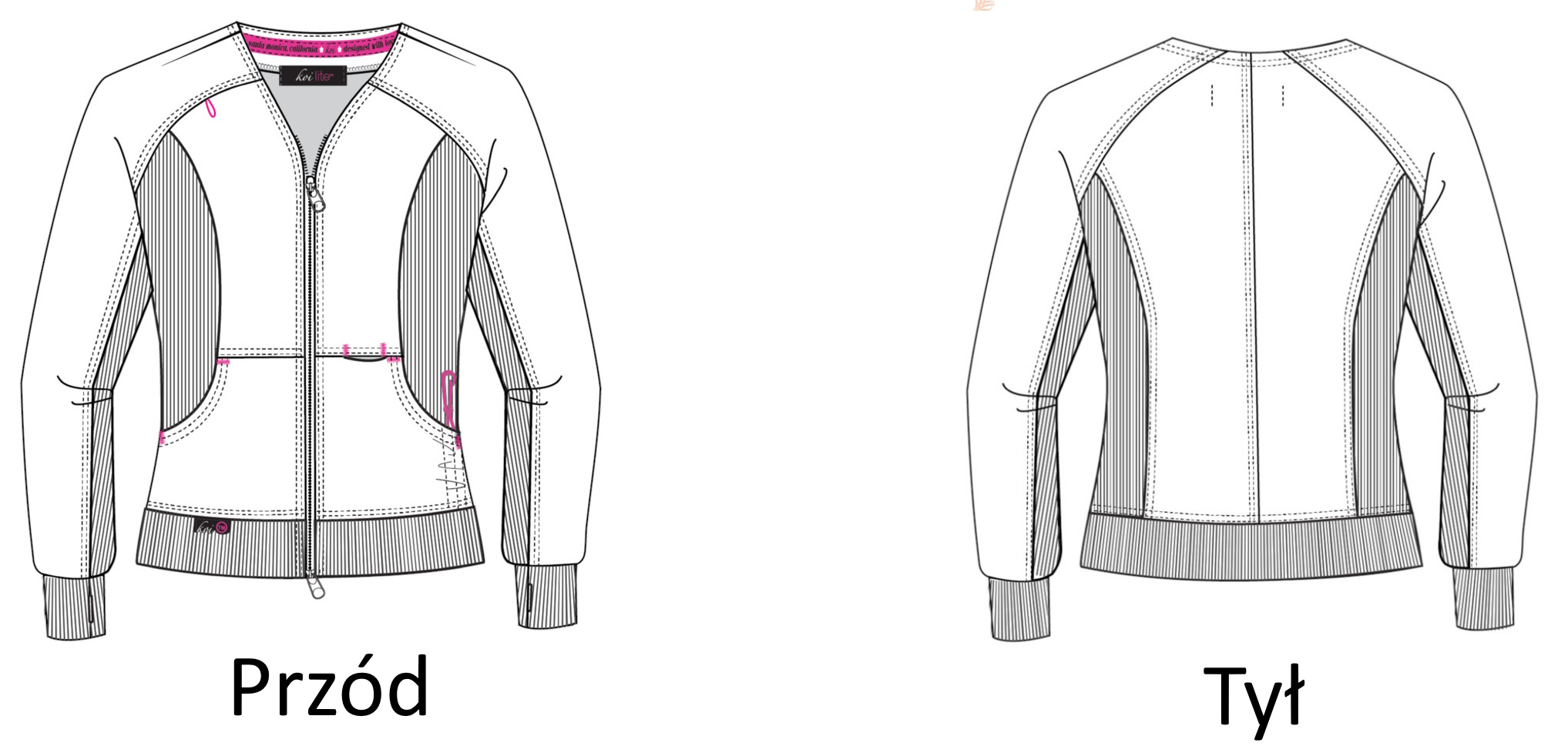 Bluza medyczna z długimi rękawami zakończonymi charakterystycznymi mankietami mającymi dziurkę na kciuk. Podwójny zamek działający w dwóch kierunkach zabezpiecza przed chłodem lub przegrzaniem. Dzianinowe wstawki nadają bluzie elastyczności i dopasowują ją do Twojej sylwetki.