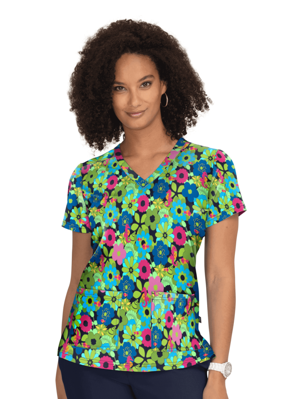 Kolorowa damska bluza medyczna w różnobarwne kwiaty, w przeważającym kolorze zieleni. Lekko dopasowana do figury, ma 2 kieszenie i pętelkę na zawieszkę do identyfikatora.