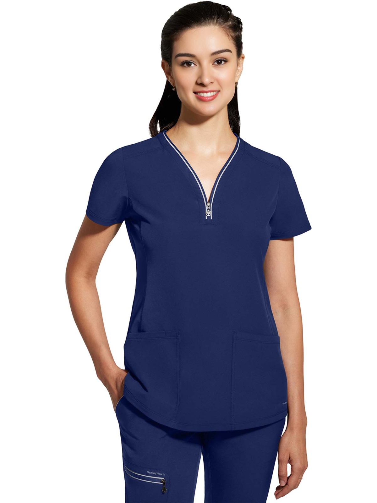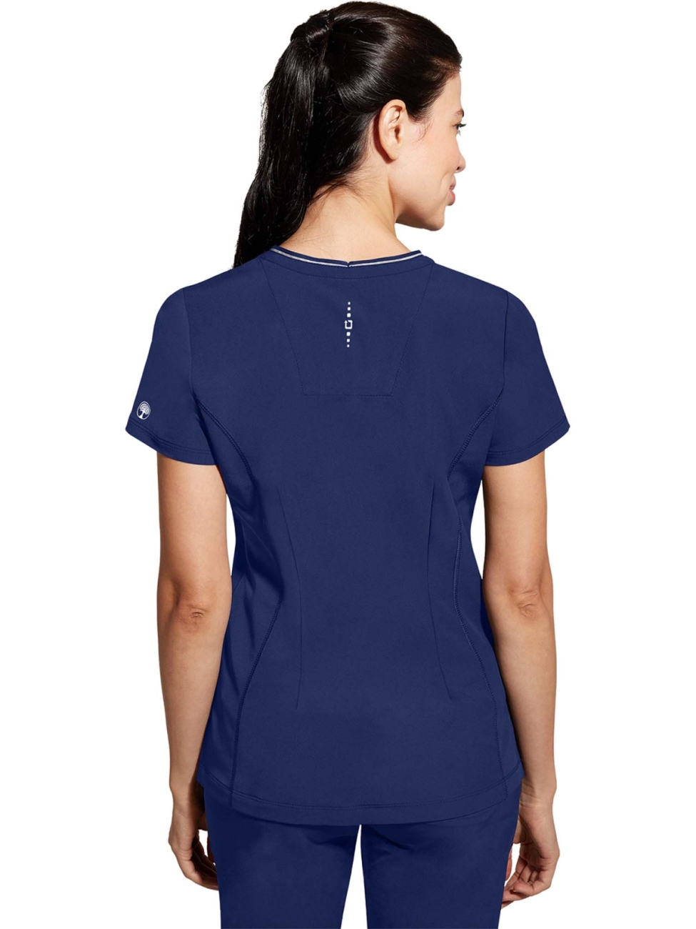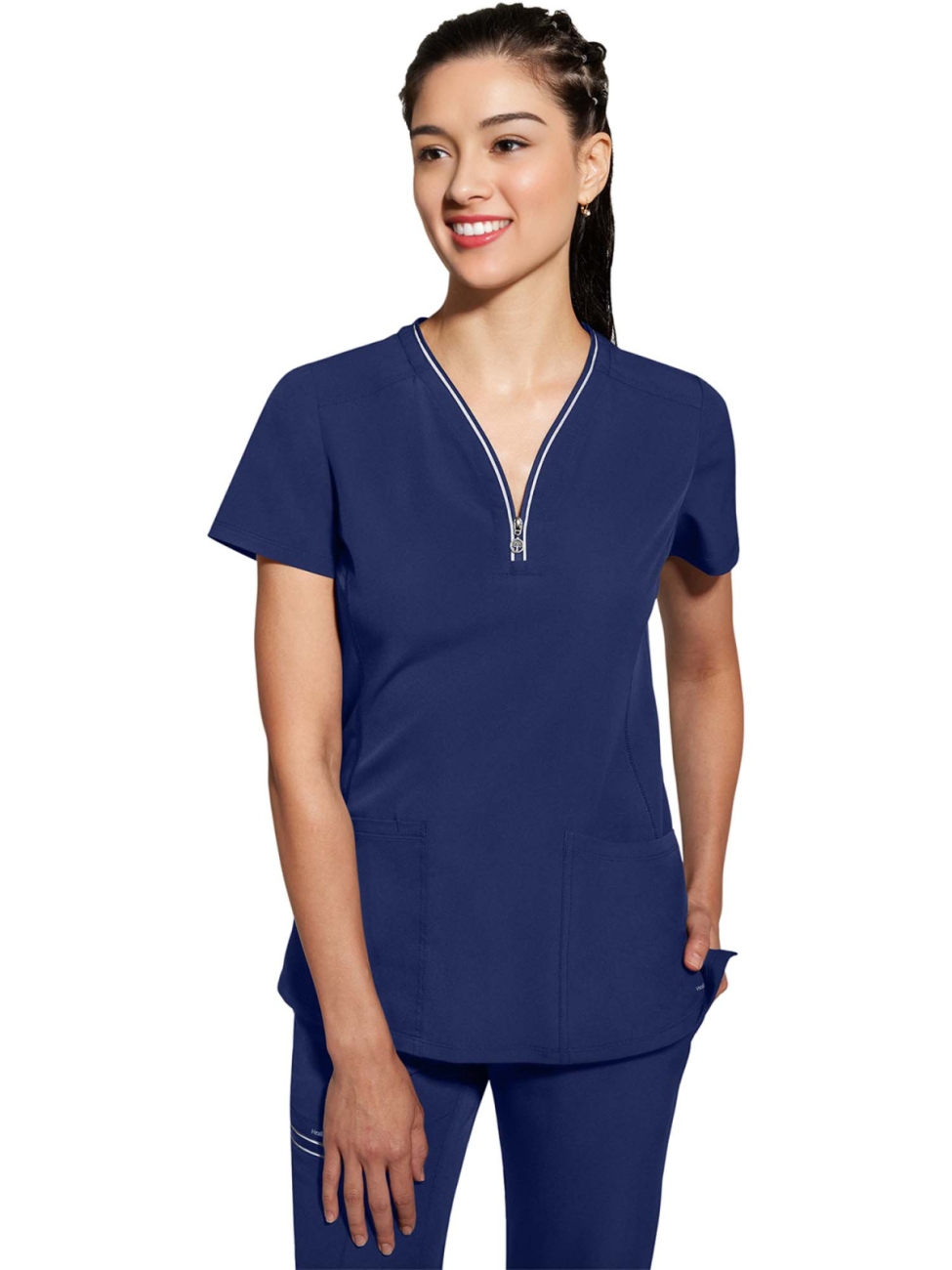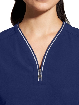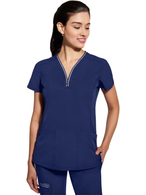 Lekko taliowana bluza medyczna z wdzięcznym dekoltem, wykończonym zameczkiem z kontrastową lamówką. Krótkie rękawki dobrze wyglądają z bocznymi wstawkami ozdobionymi ukośnymi przeszyciami.