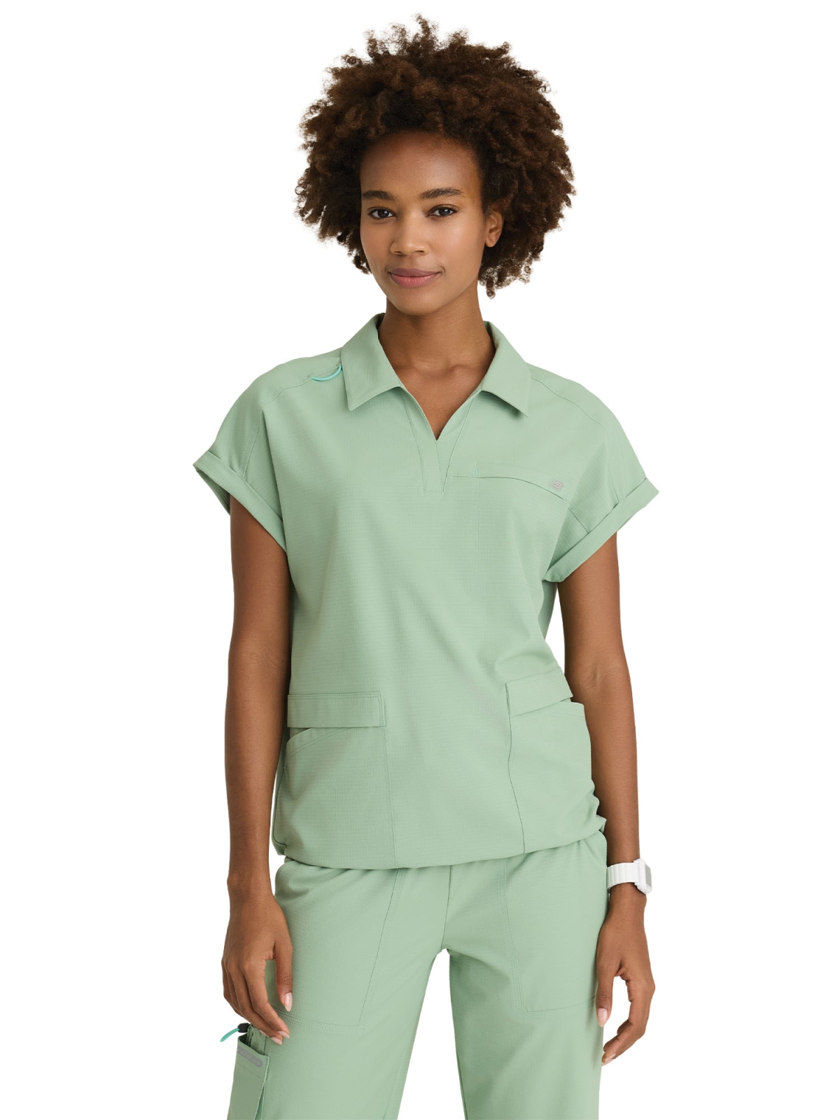 Charlie to nowoczesna bluza medyczna z kołnierzykiem koszulowym, 3 praktycznymi kieszeniami i regulowanym dołem, wykonana z oddychającej tkaniny 4-way stretch z recyklingu. Łączy elegancję ze swobodą ruchów, oferując wygodę i profesjonalny styl przez cały dzień pracy.