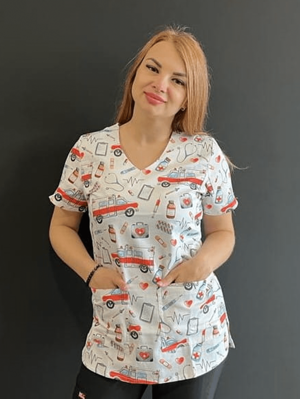 Medyczna bluza we wzorki z dekoltem V-neck sprawi, że nie zgubisz się w tłumie. Bluza posiada dwie kieszenie u dołu bluzy.
