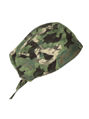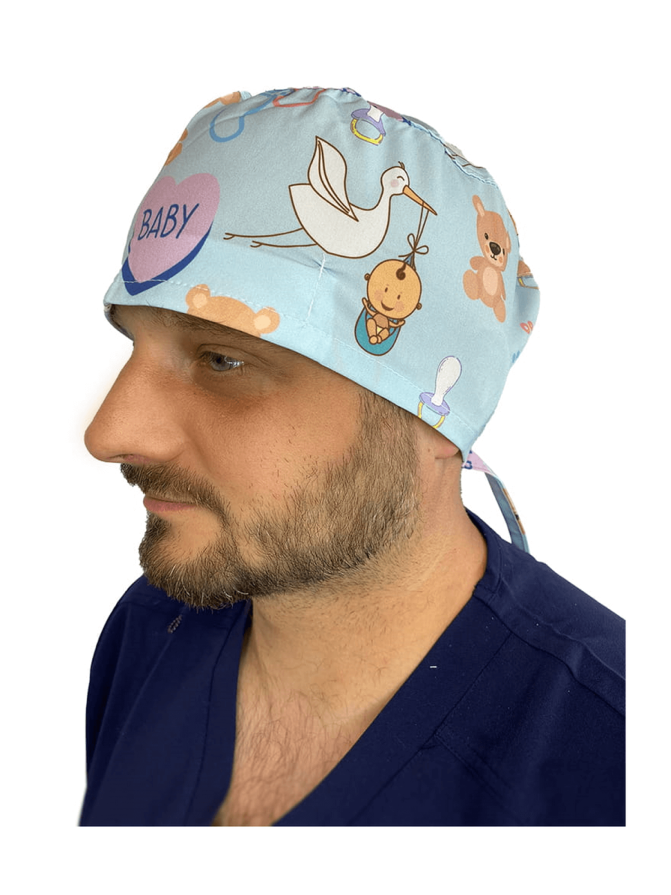 Czepek medyczny wiązany na umieszczone z tyłu tasiemki . Na przodzie czepka dla lepszego dopasowania została wszyta gumka.