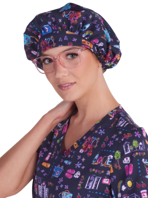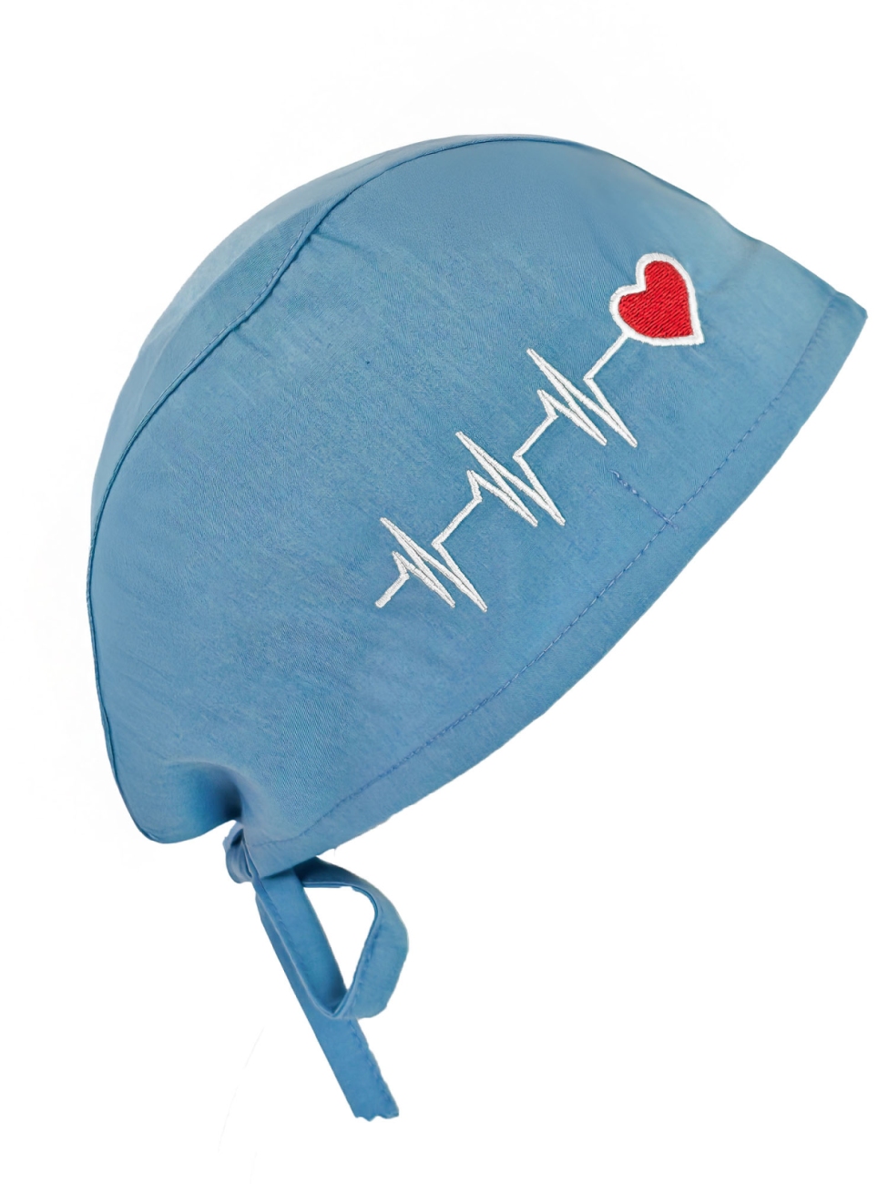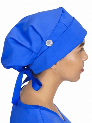 Czepek medyczny wiązany na umieszczone z tyłu tasiemki . Na przodzie czepka dla lepszego dopasowania została wszyta gumka.