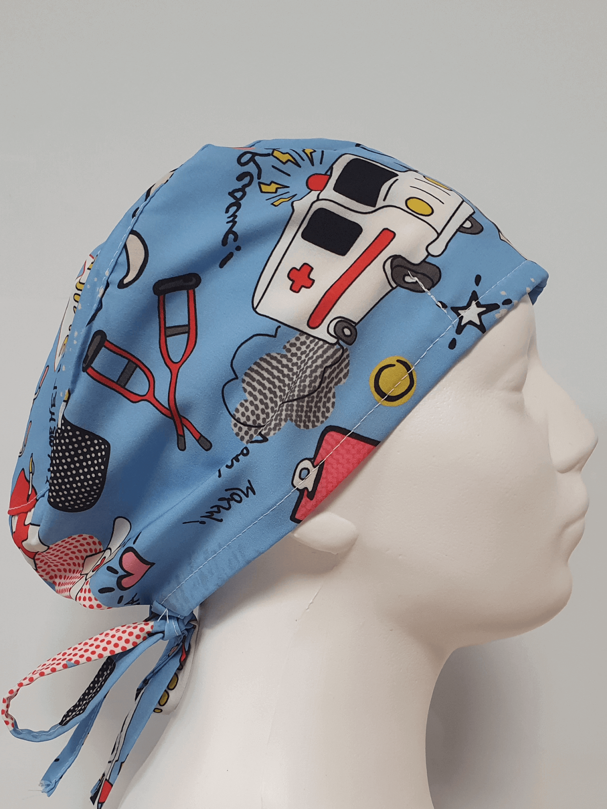 Czepek medyczny wiązany na umieszczone z tyłu tasiemki . Na przodzie czepka dla lepszego dopasowania została wszyta gumka.