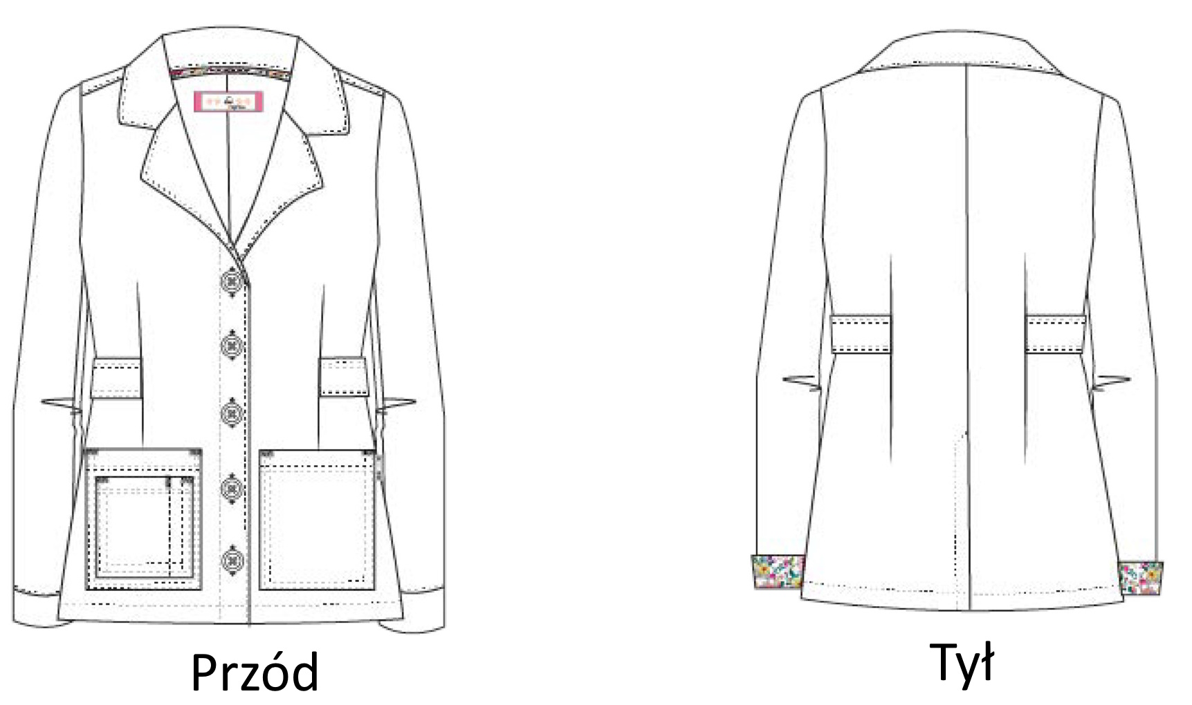Zapinany na duże guziki, dla lepszego dopasowania do sylwetki ma na bokach paski również regulowane na guziczki.