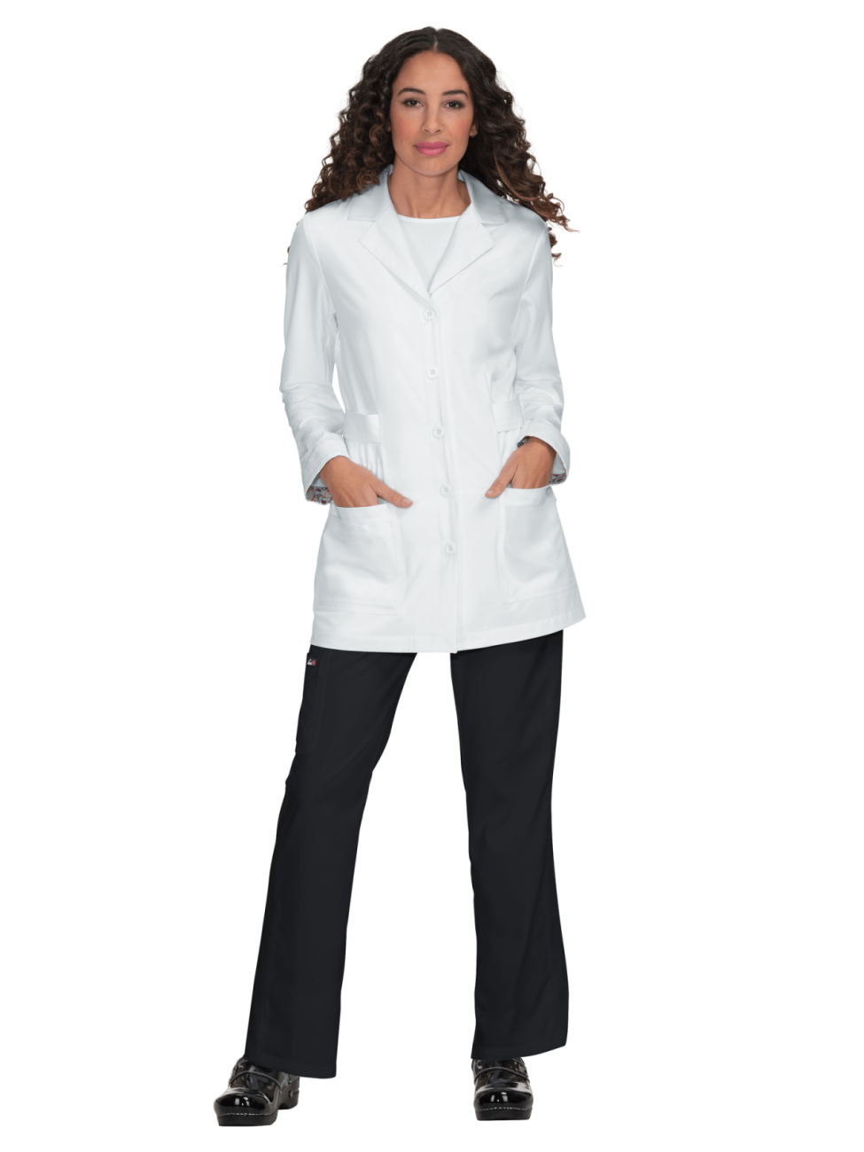 Fartuch medyczny z małym kołnierzykiem z wcięciami, zapinany na guziki, z kolorowym wykończeniem wnętrza mankietów i karczku.Najlepiej wygląda z lekko wywiniętymi rękawami.