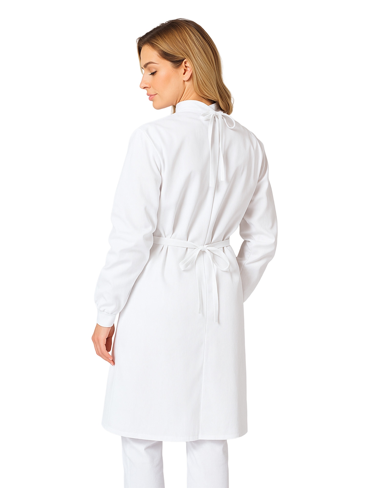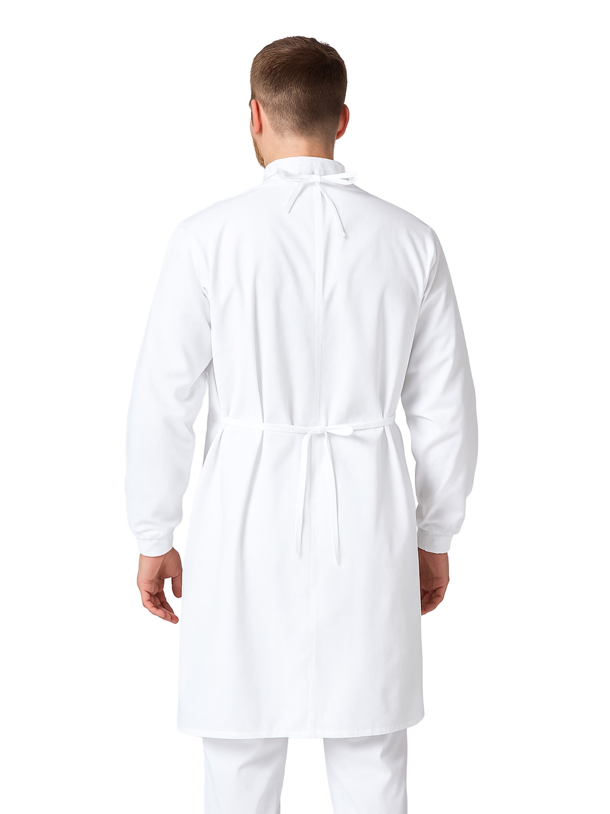 Fartuch medyczny prosektoryjny zabiegowy w kolorze białym, wytrzymały na tarcie i przebarwienia. Rękawy wykończone ściągaczami zapewniają większą higienę przy noszeniu rękawiczek medycznych a wygodne wiązanie z tyłu zapewnia komfort noszenia.