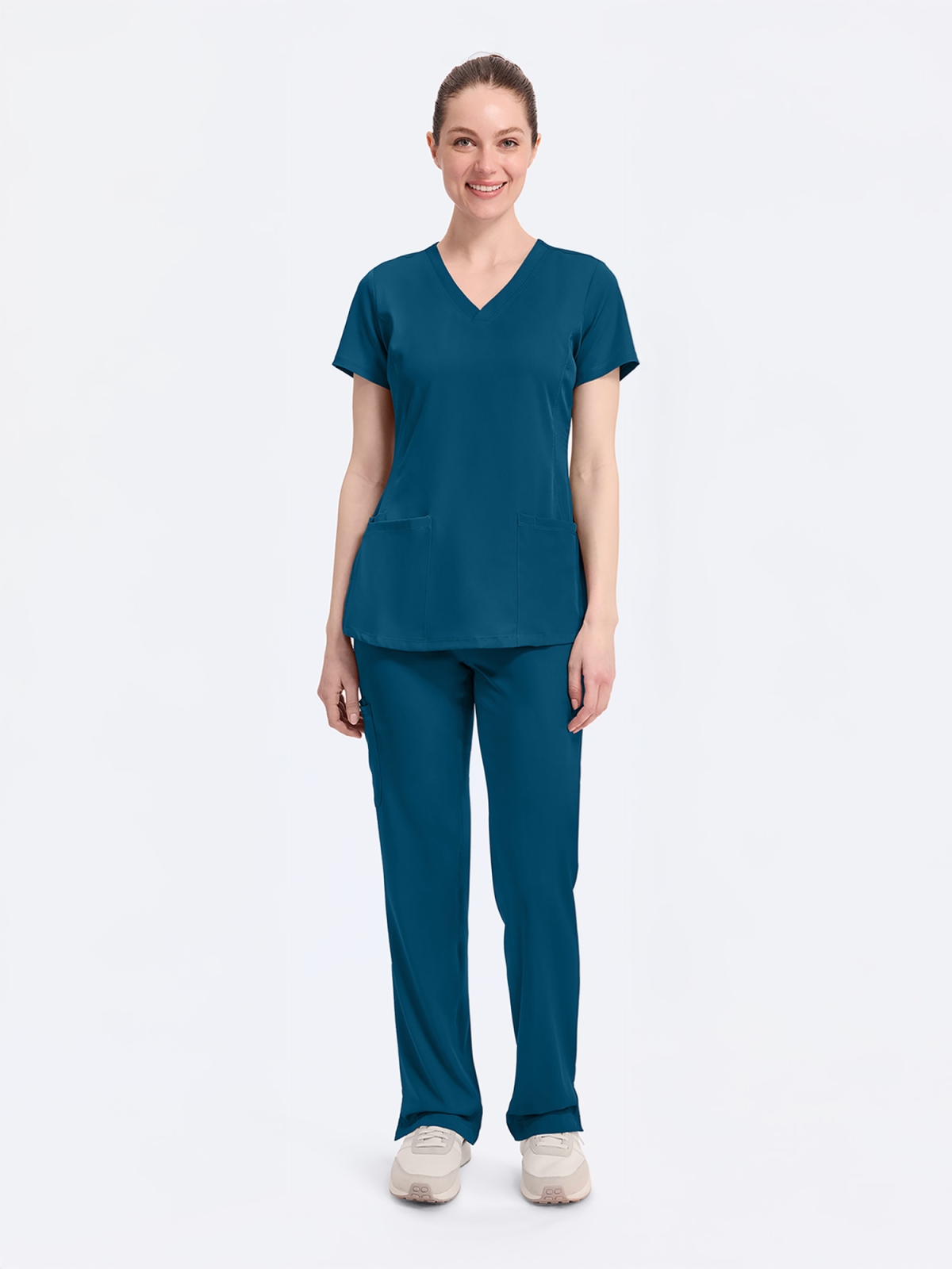 Medyczny komplet damski składający się z wysmuklającej figurę bluzy z dekoltem typu V i luźnych spodni z prostą nogawką. Zarówno bluza jak i spodnie mają po kilka kieszeni, co sprawia, że są nie tylko komfortowe ale i bardzo funkcjonalne.