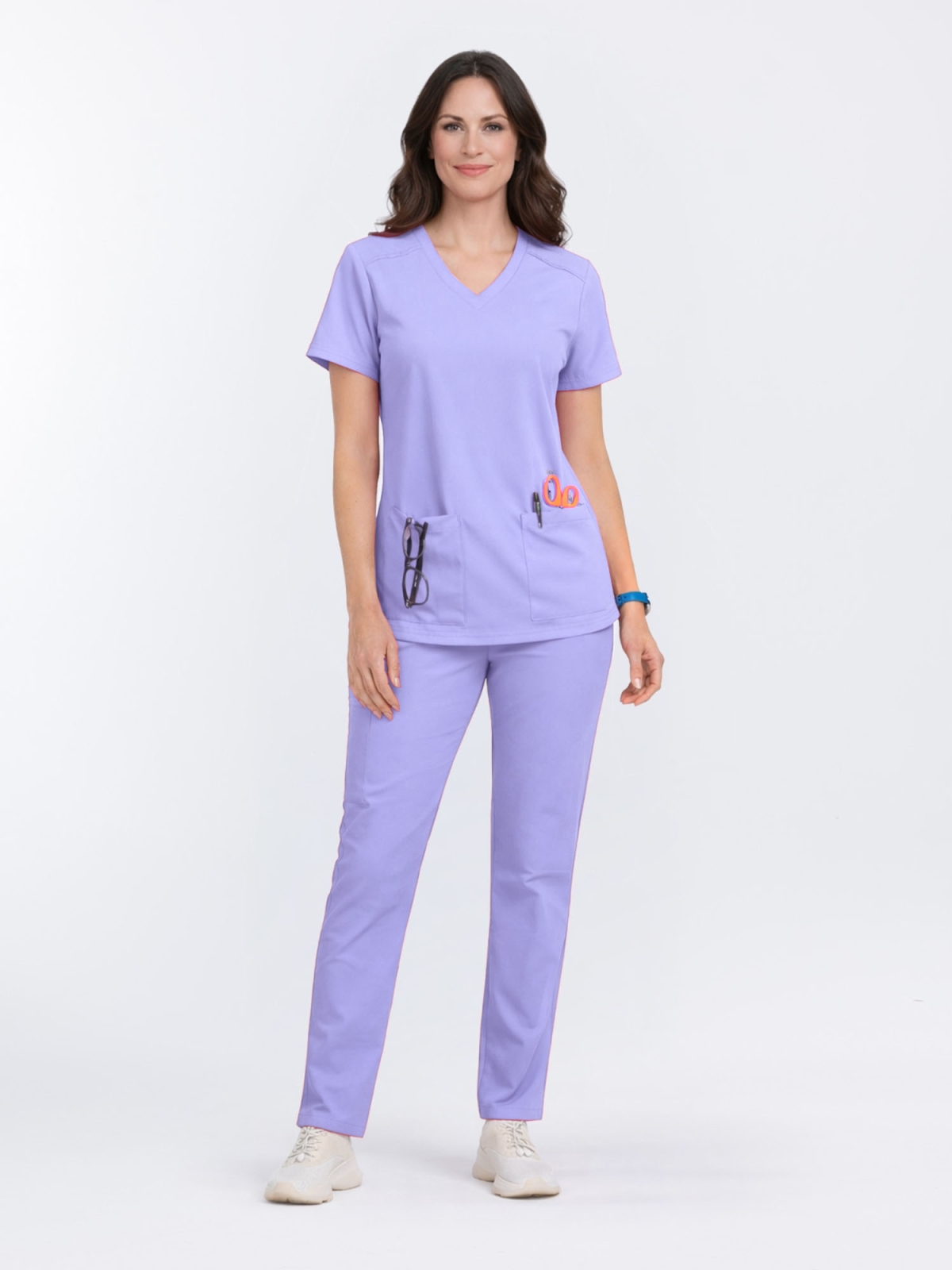 Damski komplet medyczny złożony z unikatowej bluzy z dekoltem w trójkąt z dwoma kieszeniami na przodzie oraz spodniami z prostą nogawką.