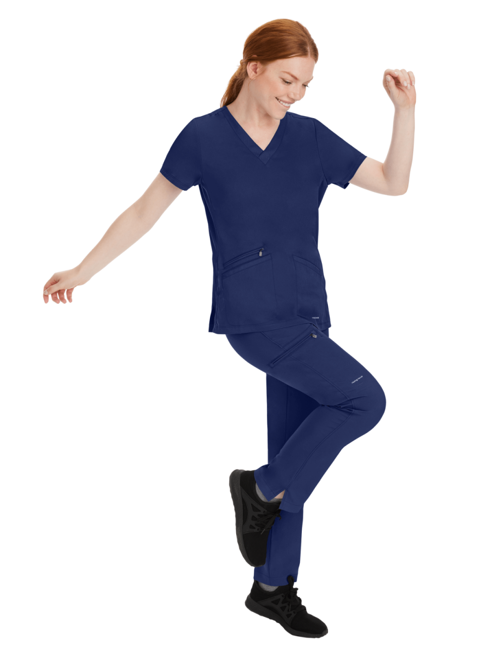 Funkcjonalne kieszenie (na telefon, nożyczki, długopis), sprytne cięcia i elastyczne wstawki – każdy element ma swoje zadanie. Efekt? Organizacja pod ręką, mniej zbędnych ruchów, więcej uwagi dla pacjenta.