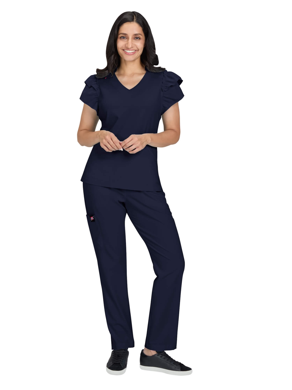 Komplet medyczny składający się za bluzy medycznej, która łączy elegancki krój z funkcjonalnością, oferując falbanki przy kołnierzu i rękawach oraz spodni medycznych z pasem wykończonym także falbankami z prostą nogawką.