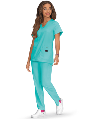 Zawartość aż 22% sztucznego jedwabiu sprawia, że scrubsy są niesamowicie przyjemne w dotyku i luksusowo miękkie. Dzięki elastanowi materiał rozciąga się w czterech kierunkach, podążając za Tobą na każdym kroku – od sali zabiegowej po popołudniową kawę.