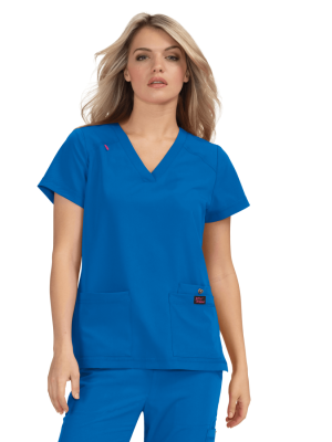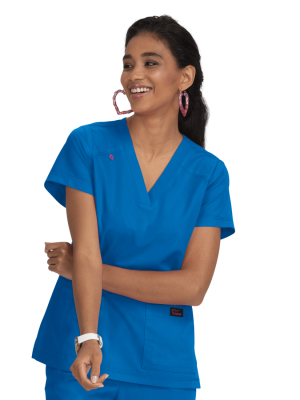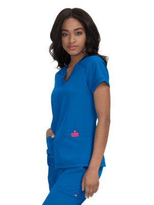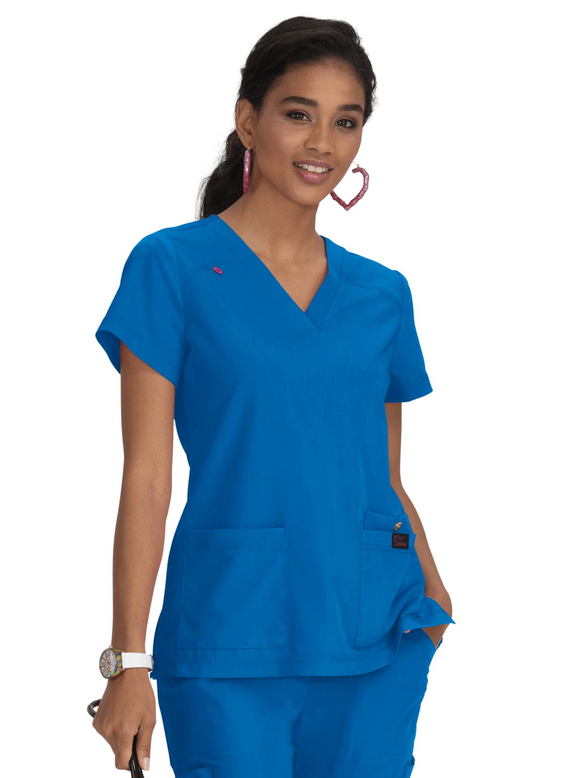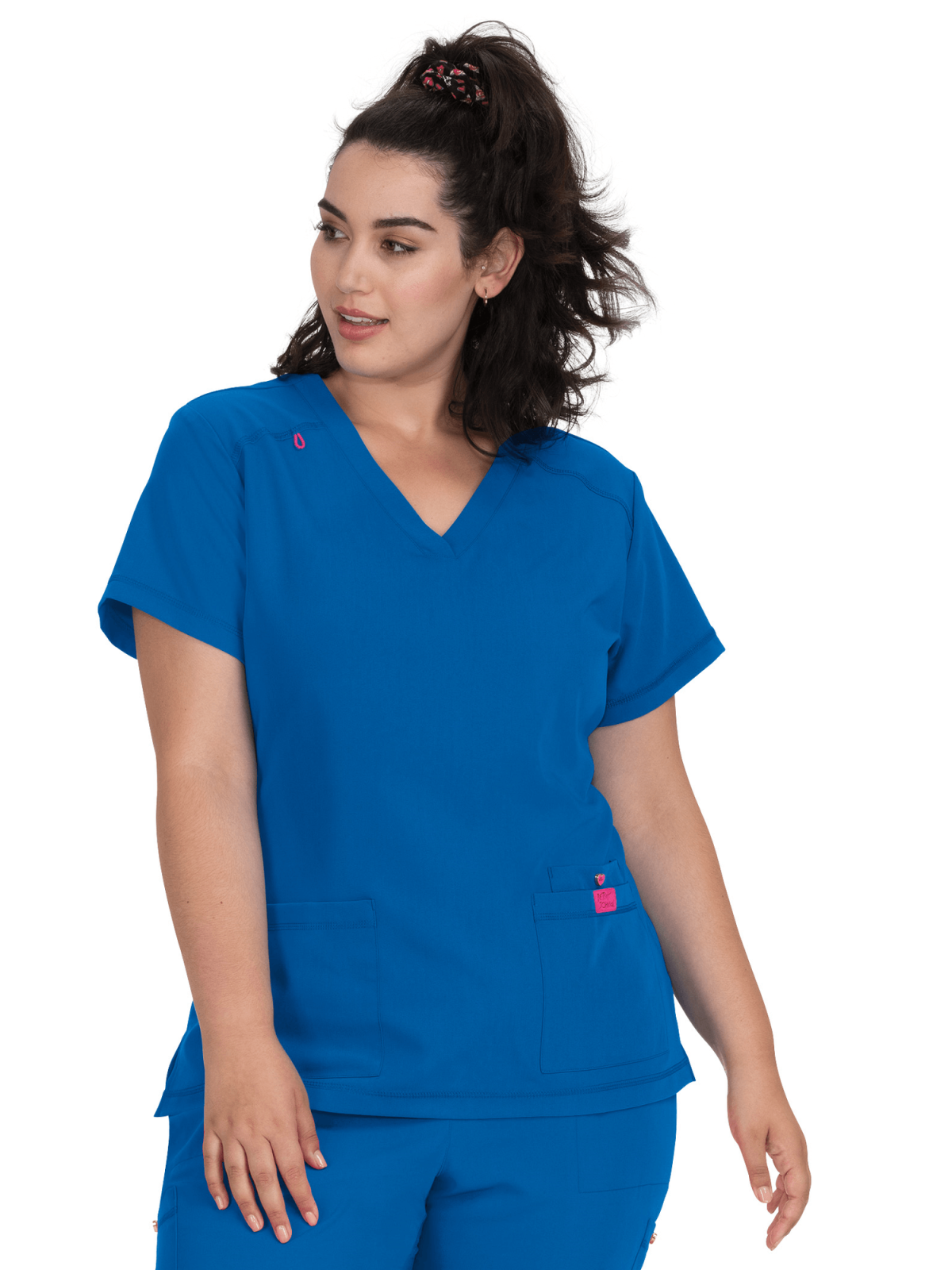 Perfekcyjnie skrojona, taliowana bluza medyczna damska Freesia uprzyjemni Ci dyżur wyjątkowo miłą w dotyku tkaniną, nieograniczającą Twoich ruchów i współpracującą z Tobą przez cały dzień, dzięki zawartości rozciągliwego elastanu. Jedwabista miękkość wynika z zastosowanego w 22% sztucznego jedwabiu. Ta bluza medyczna posiada trzy głębokie kieszenie w tym jedną na zatrzask w kształcie serduszka, w której Twoje najcenniejsze akcesoria będą bezpieczne. Kieszeń poniżej ozdobiona metką Betsey Johnson, która razem z serduszkiem powyżej tworzy piękną ozdobę charakterystyczną dla modeli tej kolekcji scrubsów medycznychPrecyzyjnie odszyty dekolt w kształcie podwójnej litery V uwydatnia solidność wykonania bluzy w każdym calu.