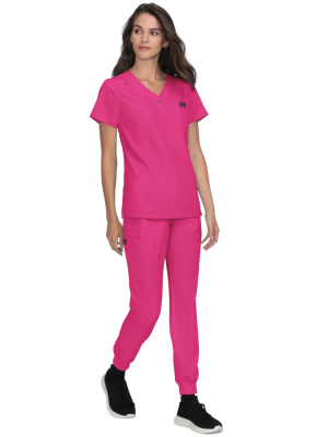 Damski komplet medyczny łączący wygodną bluzę o nietypowym dekolcie i rozcięciami na biodrach ze spodniami typu joggery wyposażonymi w 6 kieszeni. Temu eleganckiemu zestawowi uroku dodają kieszonka na piersi bluzy oraz przeszycie w kształcie serca na tyle spodni.