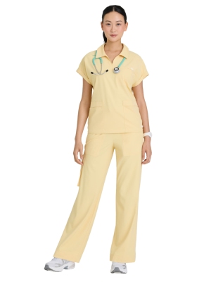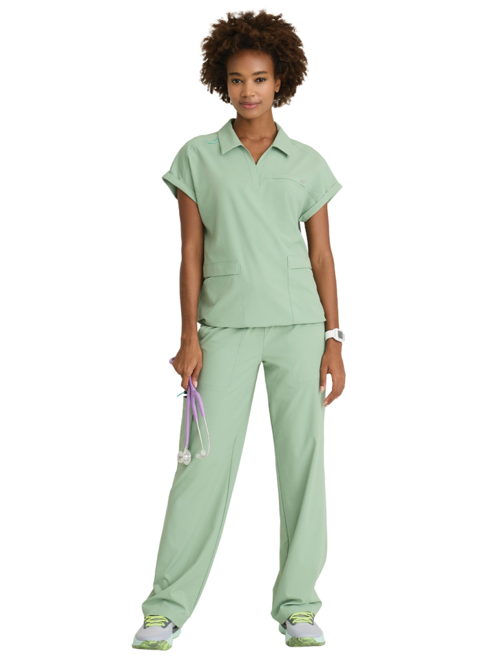 Tkanina 4-way stretch to mieszanka 52% poliestru, 39% poliestru z recyklingu i 9% spandexu — oddychająca, elastyczna i odporna na zagniecenia. Dzięki odprowadzaniu wilgoci i miękkości materiału bluza zapewnia całodzienny komfort nawet przy długich dyżurach.