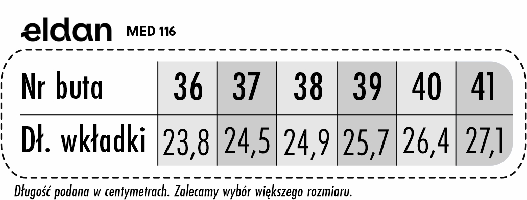 Wkładka jest o ok. 7 - 8 mm dłuższa od stopy, dlatego jeśli Twoja stopa ma 24 cm, zlecamy wybór rozmiaru 38.