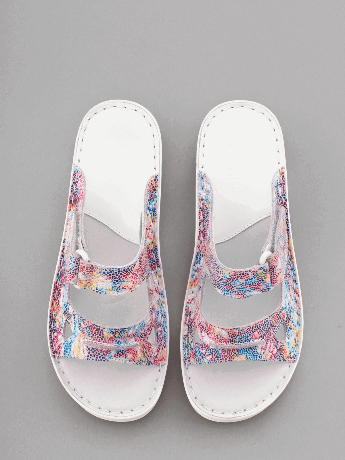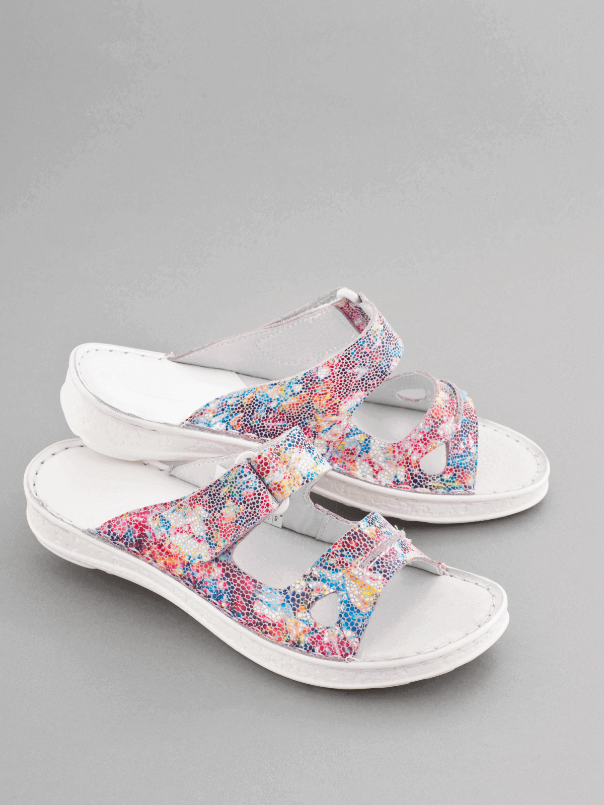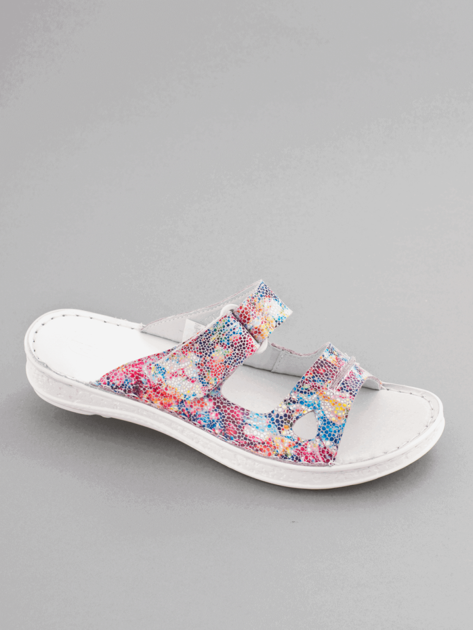Medyczne klapki damskie, których wyściółka i wierzch zostały wykonane ze skóry.