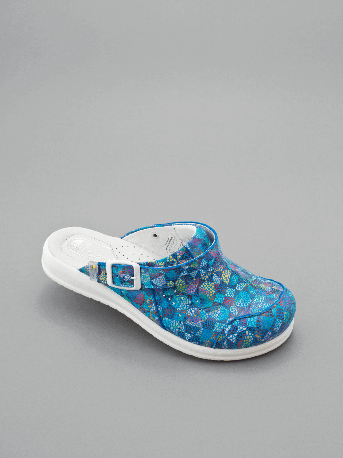 Super wygodne klapki damskie medyczne wykonane z naturalnej skóry. Podeszwa zrobiona jest z tworzywa sztucznego. Klapki mają ruchomy pasek, który możesz nosić na pięcie lub na cholewce.