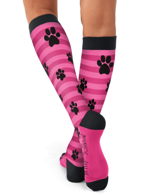 Urocze różowo-czarne podkolanówki kompresyjne we wzorki z pieskami i odciskami łapek.