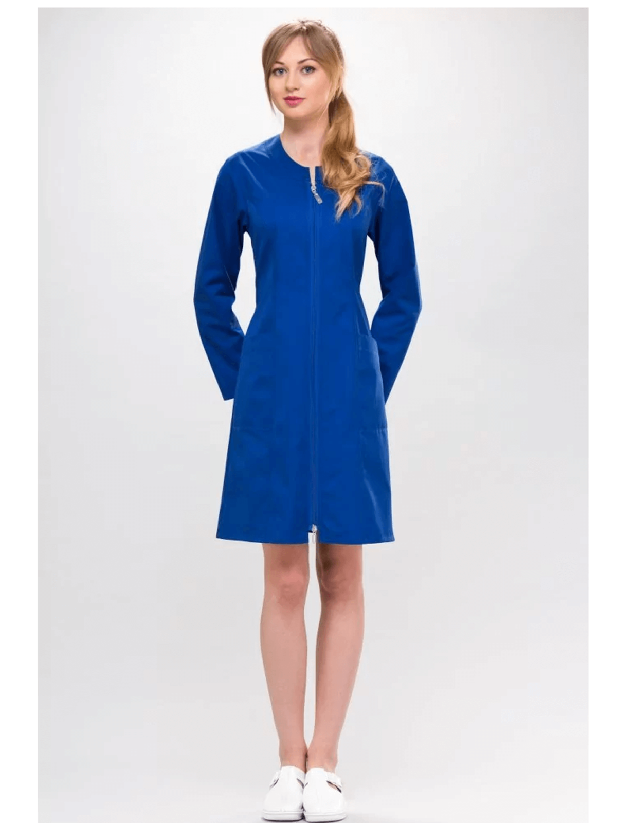 Sukienka medyczna z długim rękawem. To nieśmiertelny hit od lat! Dopasowany do figury. Dobrze prezentuje się zarówno na osobach szczupłych jak i na tych o pełniejszych kształtach. Posiada dwie głębokie kieszenie. Wierzchnie szwy ozdobnie przeszywane. Model zapinany na zamek odsuwany od góry i od dołu.