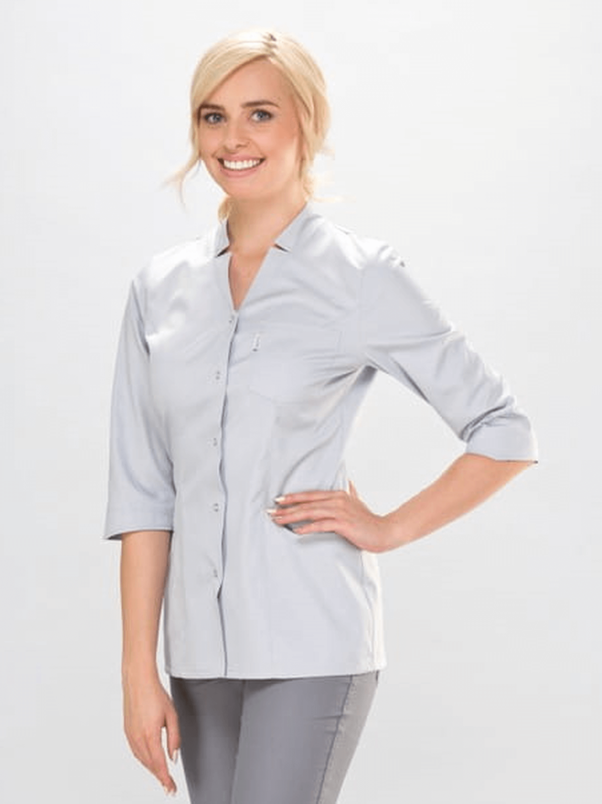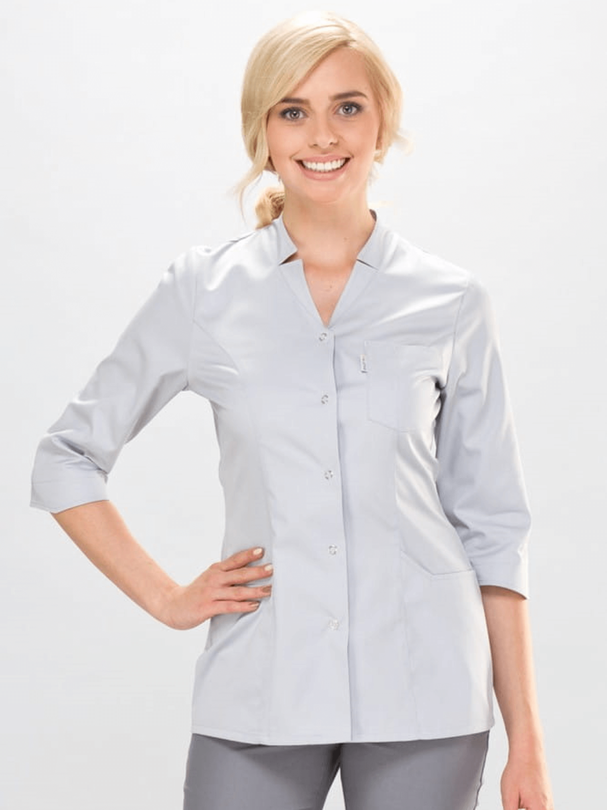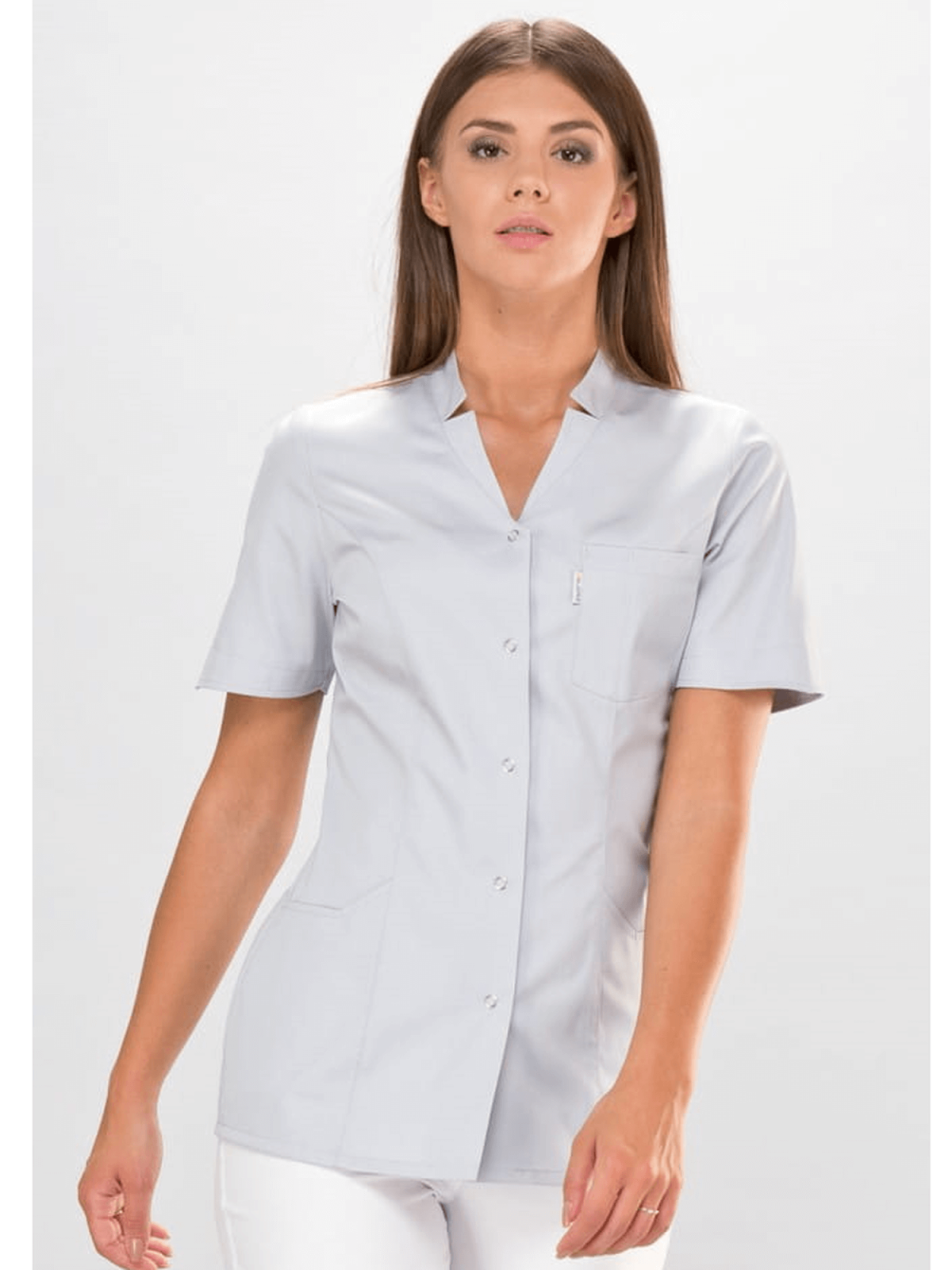 Klasyczny fartuszek medyczny z dekoltem V i kołnierzykiem w formie stójki z niewielkim rozcięciem jest idealny dla osób ceniących elegancję i klasykę. Zaszewki podkreślają smukłą figurę a kieszenie i zapięcie na napy zapewniają komfort i wygodę użytkowania.