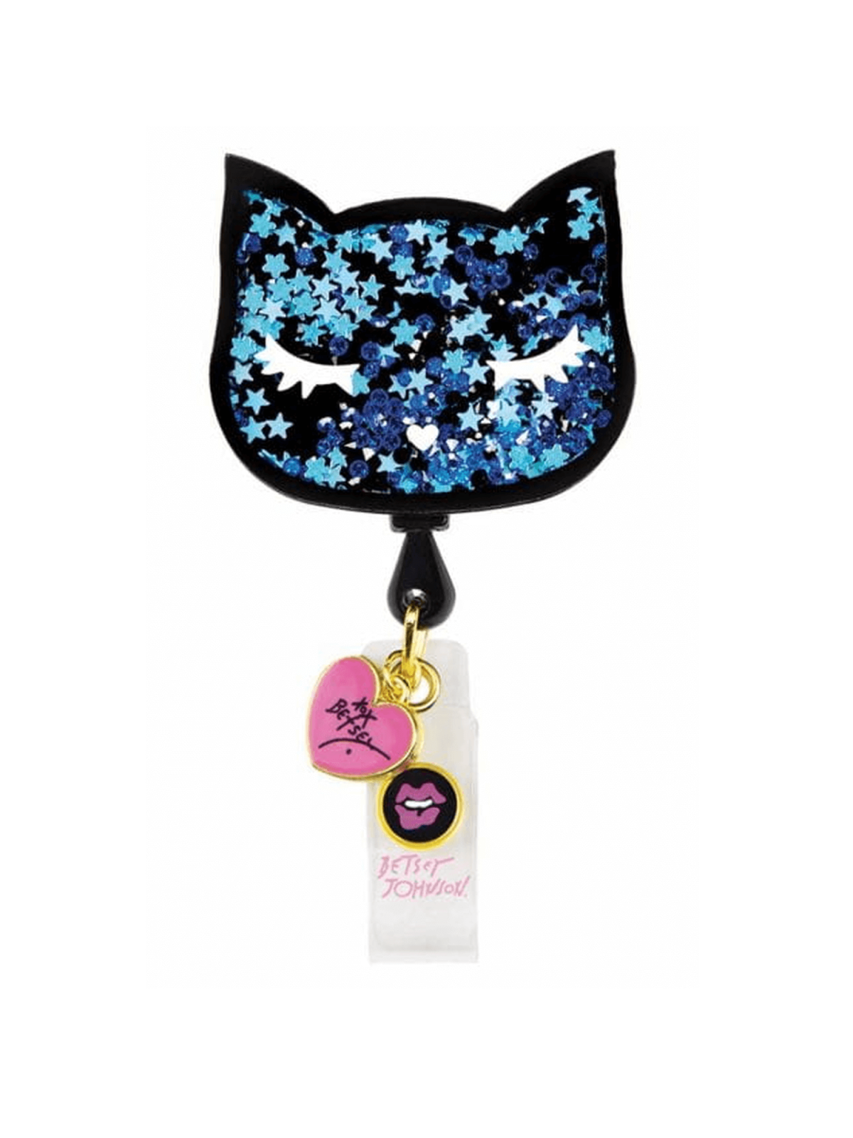 Zawieszka do identyfikatora - śpiący czarny kotek z doczepionym różowym serduszkiem i logo projektantki.