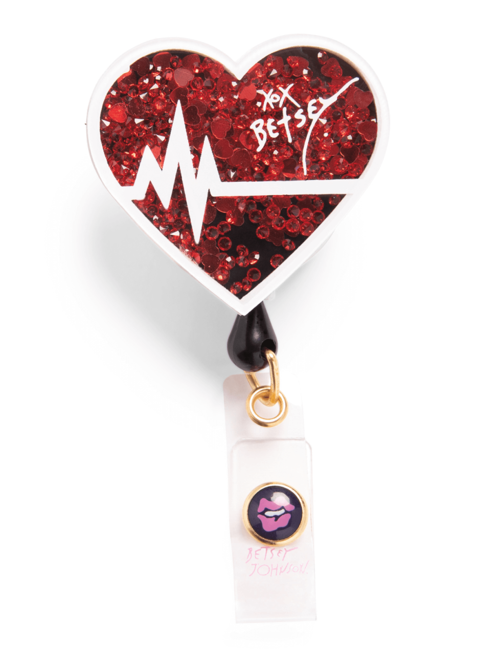 Zawieszka do identyfikatora - serduszko wypełnione czerwonymi kryształkami, z rysunkiem EKG i logo projektantki.