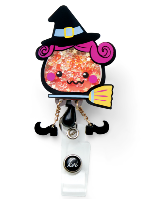 Zawieszka do identyfikatora w kształcie cukierkowej wiedźmy na miotle.