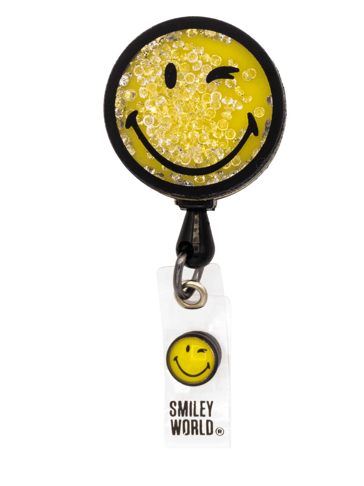 Zawieszka do identyfikatora w kształcie buźki z przymrużonym oczkiem wypełnionej drobinkami.